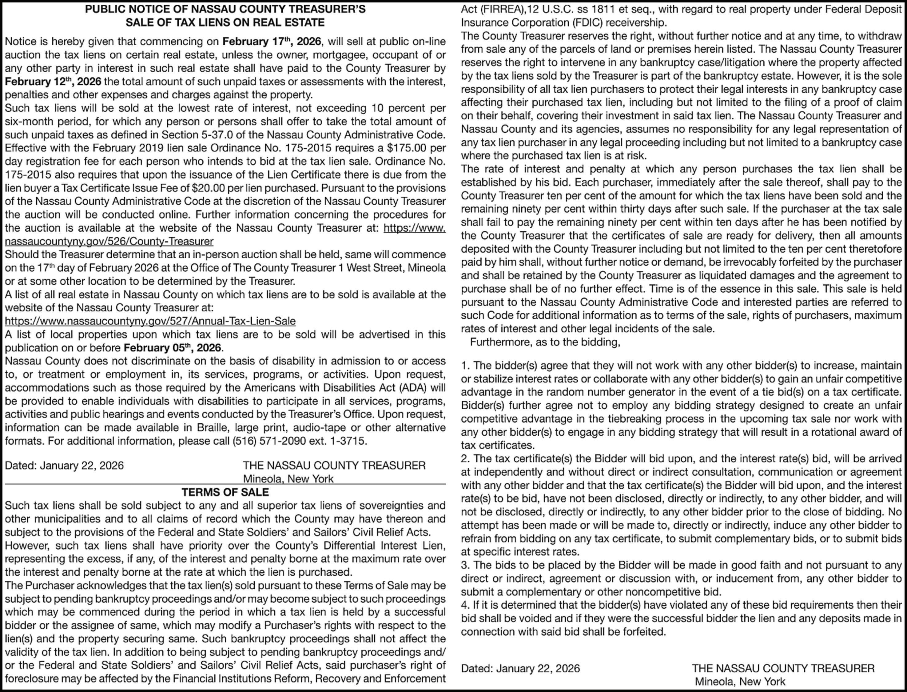 Residents running for election to the Village Board of Trustees in the March 18, 2026 election will have an opportunity to present their views and answer questions at a village-wide Town Hall sponsored by the POAs’ Joint Conference Committee. The Town Hall will take place on Tuesday, February 3, 2026, at 7:30 p.m. at the Garden City Senior Center, 6 Golf Club Lane.