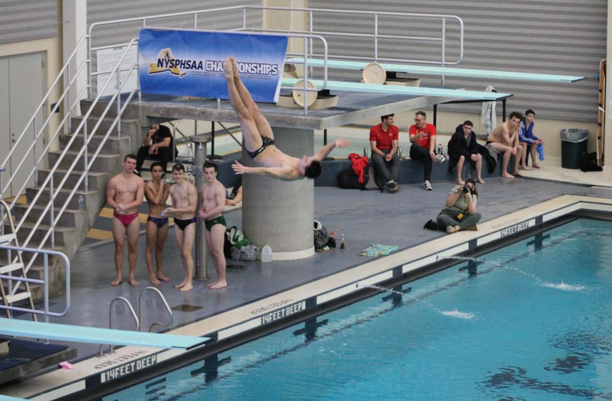 The Garden City Boys Varsity Swim and Dive season came to a close as the team sent five athletes to Ithaca to compete in the NYSPHSAA State Championships. The Trojans were led by senior captains, Liam Harty, and West Point commit, Julien Crampe, as they represented Garden City against the top swimmers and divers from across New York State.