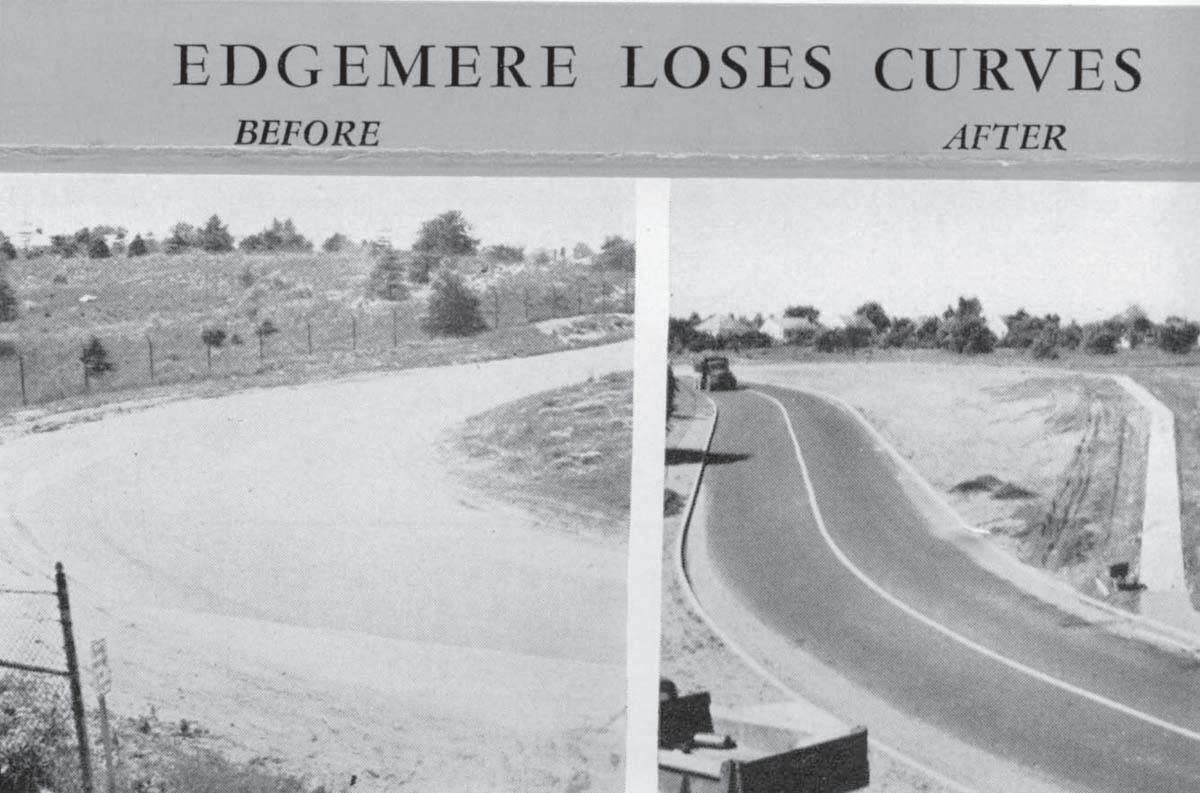 Views of Edgemere Rd. facing southwest from the railroad bridge. When Tanners Pond Rd. south of the railroad bridge through the Garden City Country Club property was discontinued in 1927 and attached to Edgemere Rd. at the higher level to its west, two sharp curves with a hill between were created to effect the connection. This dangerous situation existed until 1955, when, after extended negotiations, the Village acquired property from the GCCC and the roadway was realigned to make the transition less severe. In 1958 the area to the west of the realigned roadway became Edgemere Park.