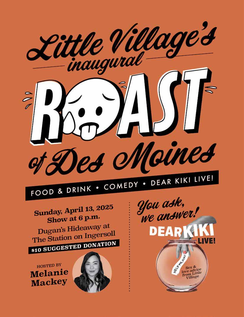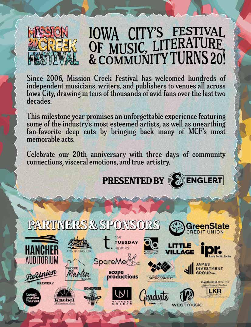 Little Village (ISSN 2328-3351) is an independent, community-supported news and culture publication based in Iowa City, published monthly by Little Village, LLC, 623 S Dubuque St., Iowa City, IA 52240. Through journalism, essays and events, we work to improve our community according to core values: environmental sustainability, affordability and access, economic and labor justice, racial justice, gender equity, quality healthcare, quality education and critical culture. Letters to the editor(s) are always welcome. We reserve the right to fact check and edit for length and clarity. Please send letters, comments or corrections to editor@ littlevillagemag.com. Subscriptions: lv@littlevillagemag.com. The US annual subscription price is $120. All rights reserved, reproduction in whole or in part without written permission is prohibited. If you would like to reprint or collaborate on new content, reach us at lv@littlevillagemag. com. To browse back issues, visit us online at issuu.com/littlevillage.