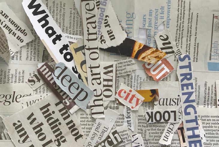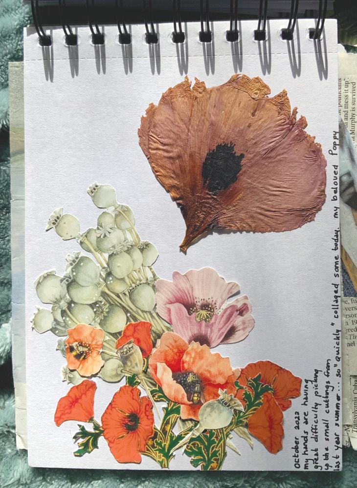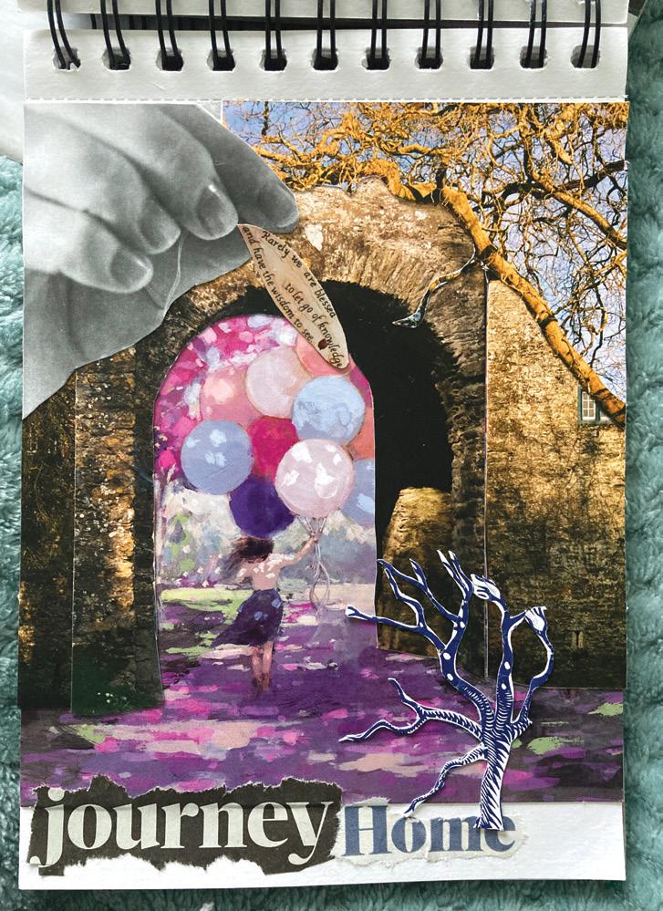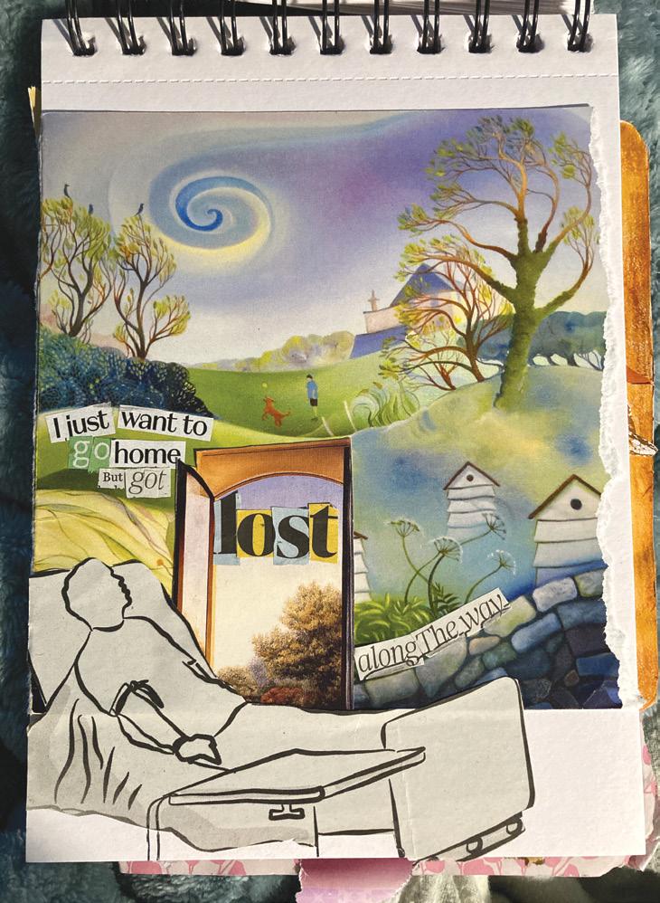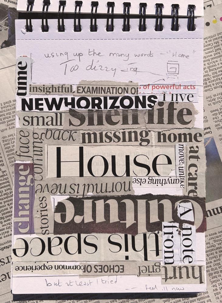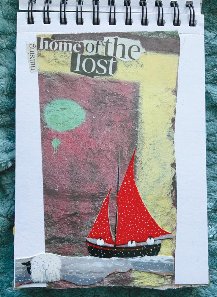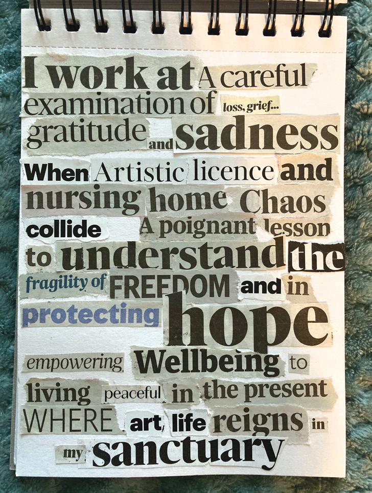 Corina addresses evergreen themes here: the idea of home, illness, ageing / loss of independence. Importantly, it highlights the value of a creative practice for both in-the-moment enjoyment and selfexpression. Corina draws us into a pattern and rhythm as we moving through from one image to the next, searching out the words in each collage – unpacking her moving observations of the life she lives.