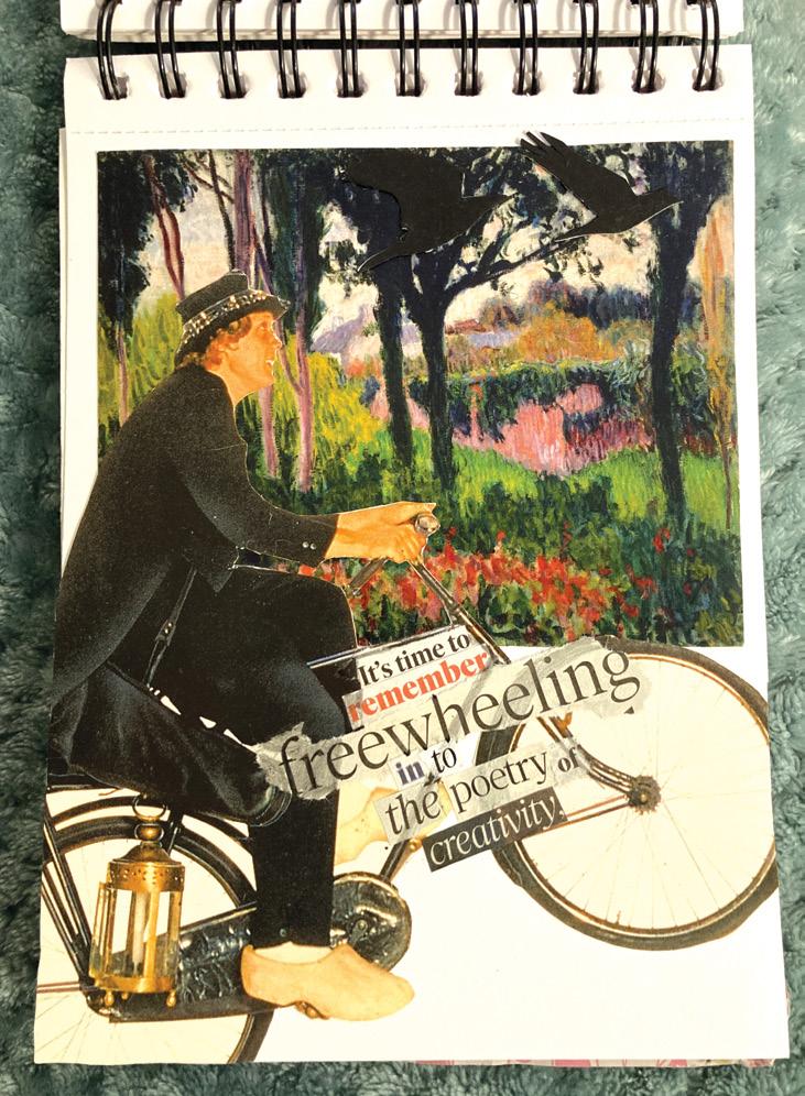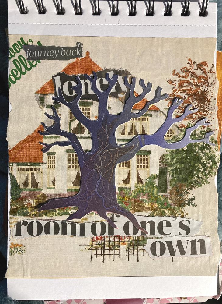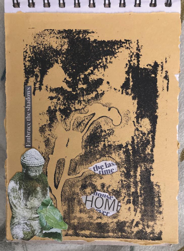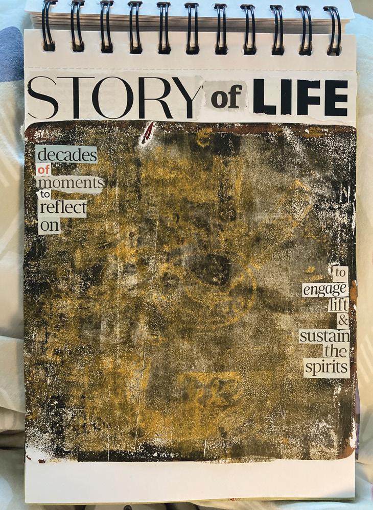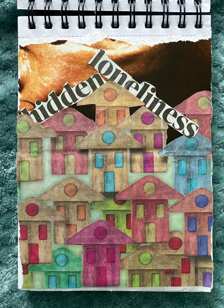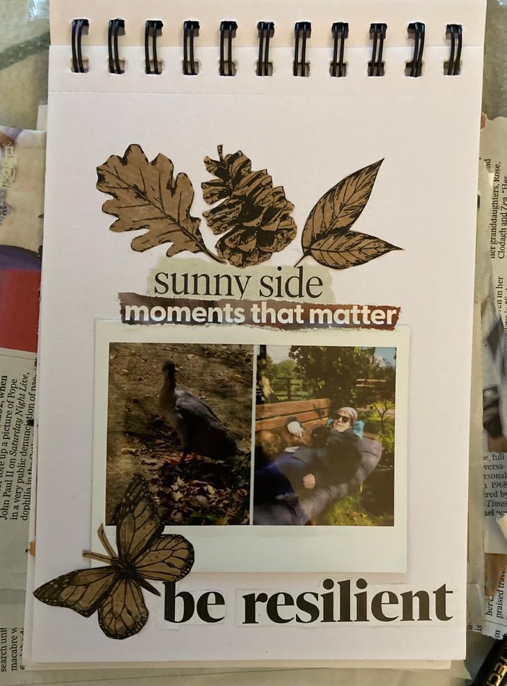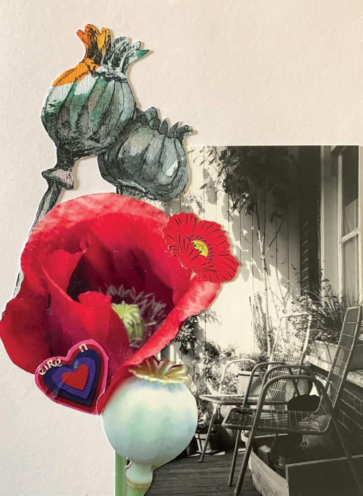 Corina addresses evergreen themes here: the idea of home, illness, ageing / loss of independence. Importantly, it highlights the value of a creative practice for both in-the-moment enjoyment and selfexpression. Corina draws us into a pattern and rhythm as we moving through from one image to the next, searching out the words in each collage – unpacking her moving observations of the life she lives.