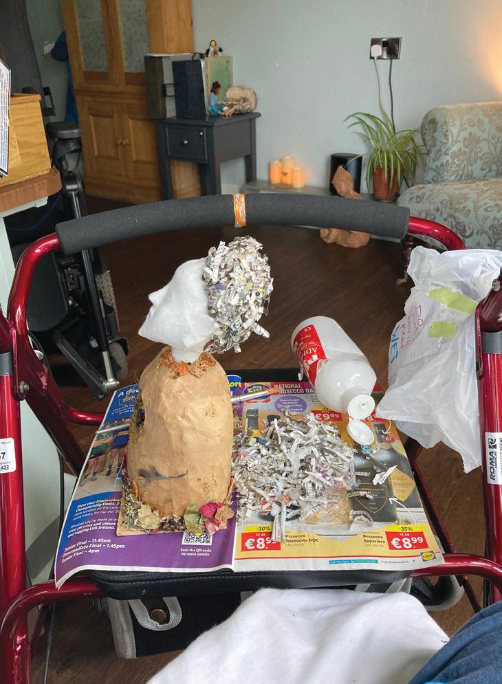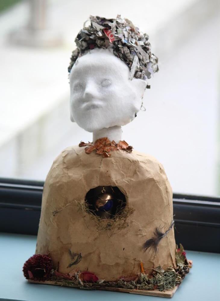 We used papier-mâché to make a bust from collected newspaper clipping finishing with brown envelopes. We, as in, the physical work done by Caroline while sharing our creative minds.