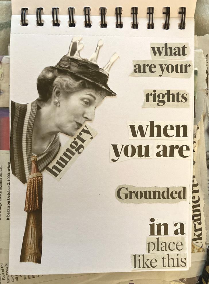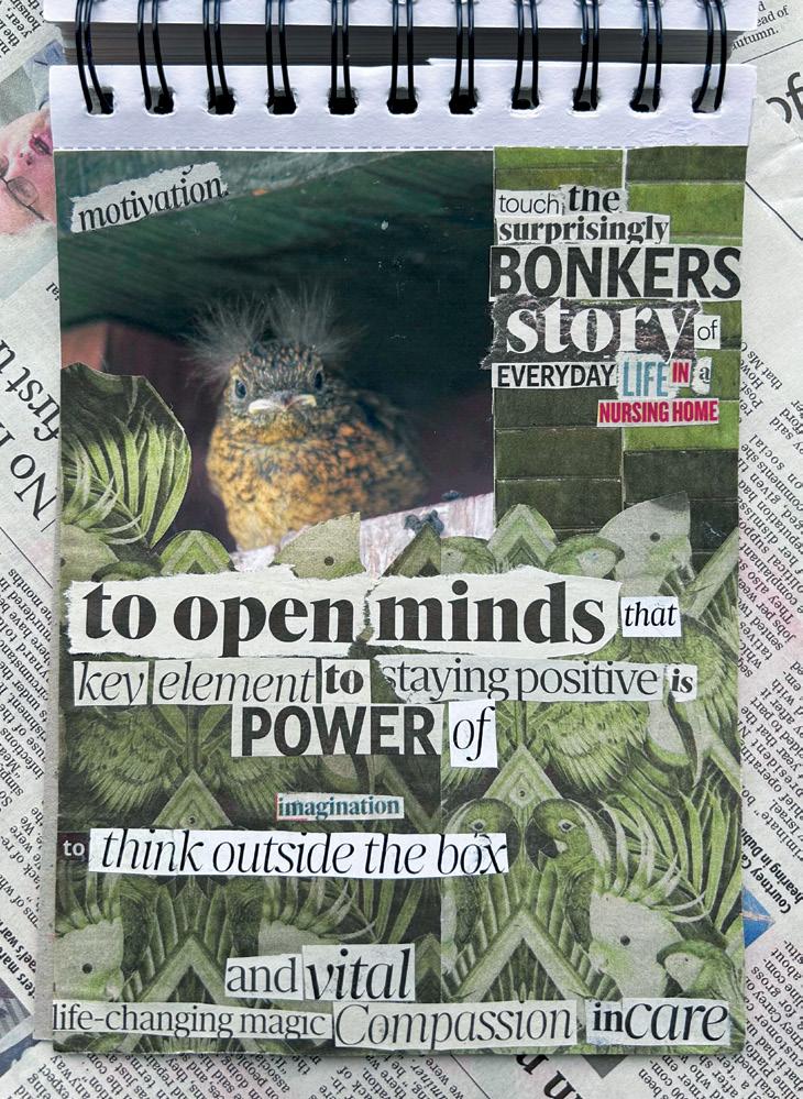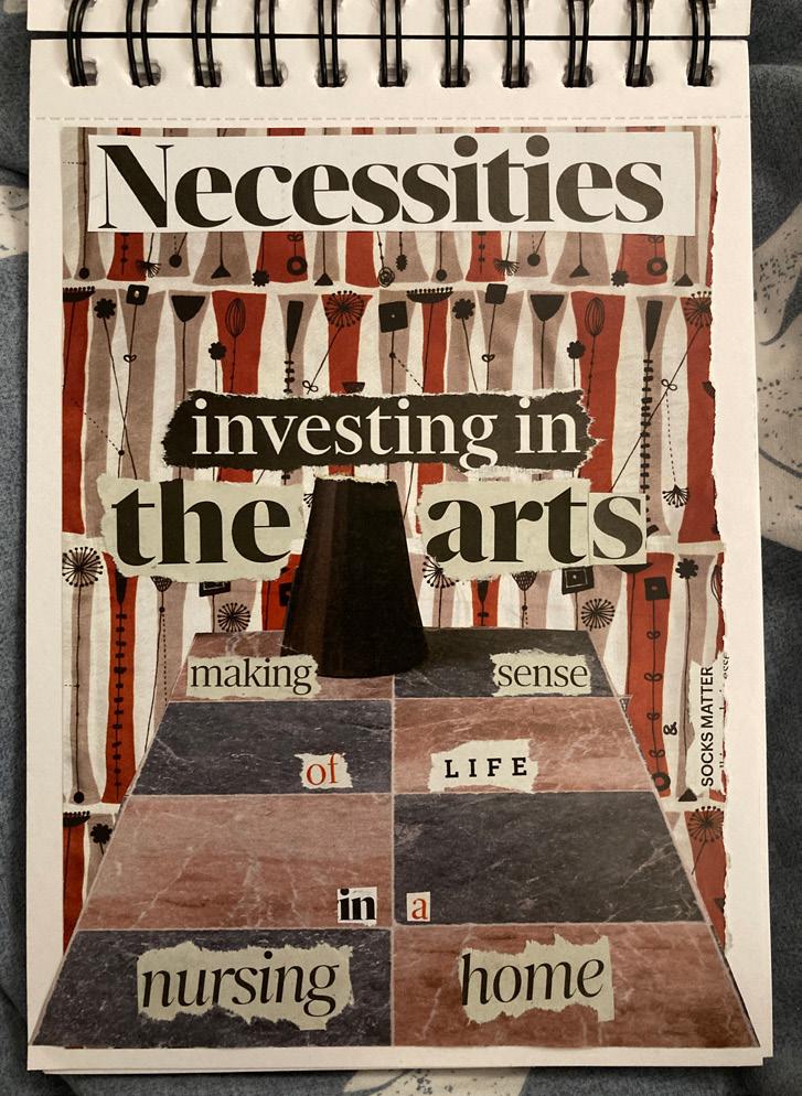 She is holding up a mirror to us, showing her experience of living in a nursing home, the everyday small things that happen and what is ahead for many of us. In these collages she is asking to be heard, not in the sense of management of her and older people, but asking what is home at an intrinsic human level.