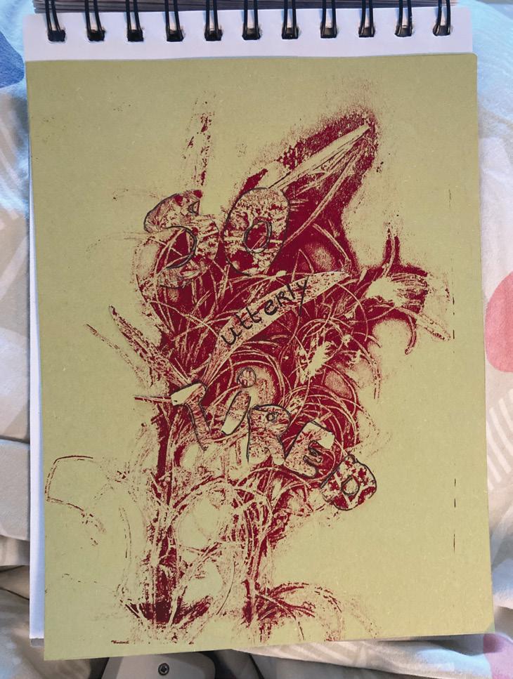 08/03/2022 - (CBW) talk in Dublin - me in bed. This helped! Made in my bed - PVA glue, tissue, lavender (Lismore) and rose petals - at Treehouse.