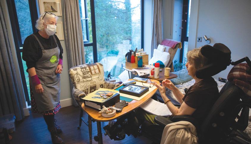 Caroline Schofield and Corina Duyn, art session in the Treehouse, Corina’s room. For further reading https://tinyurl.com/yp9y3k26. Photo credit: Keith Currums.