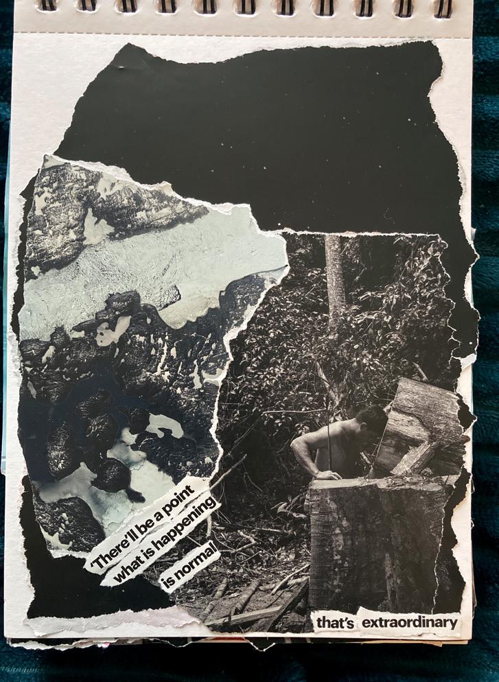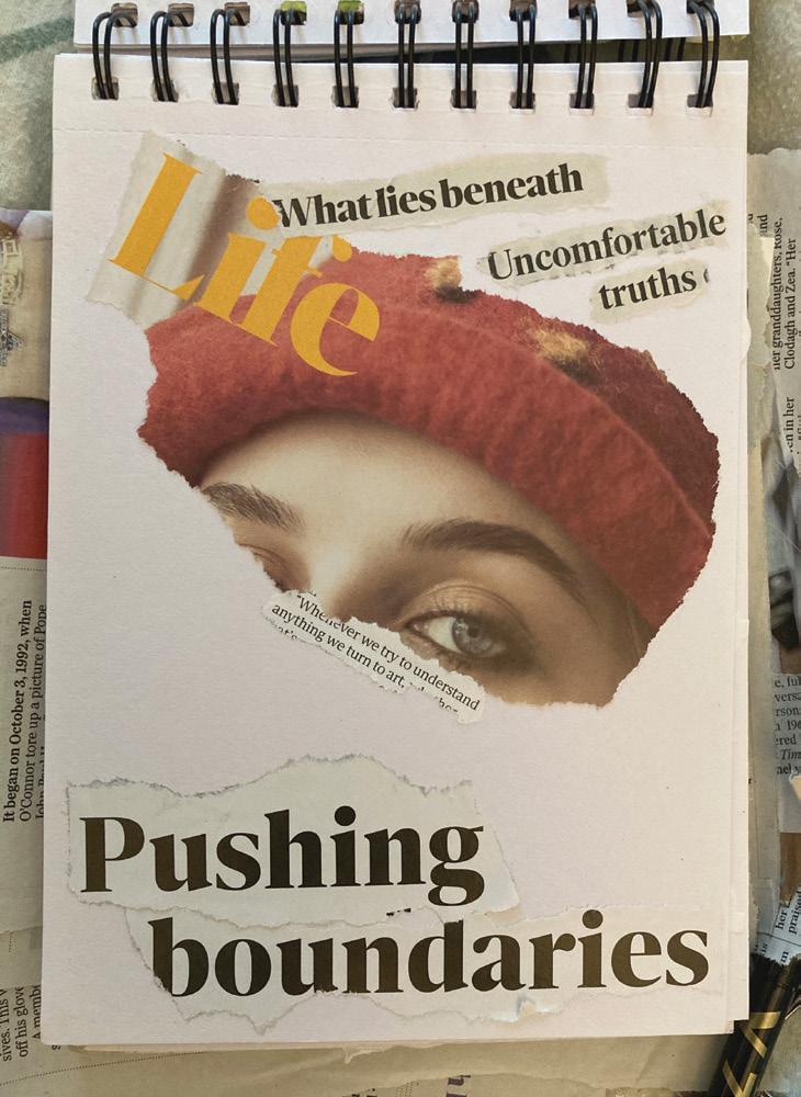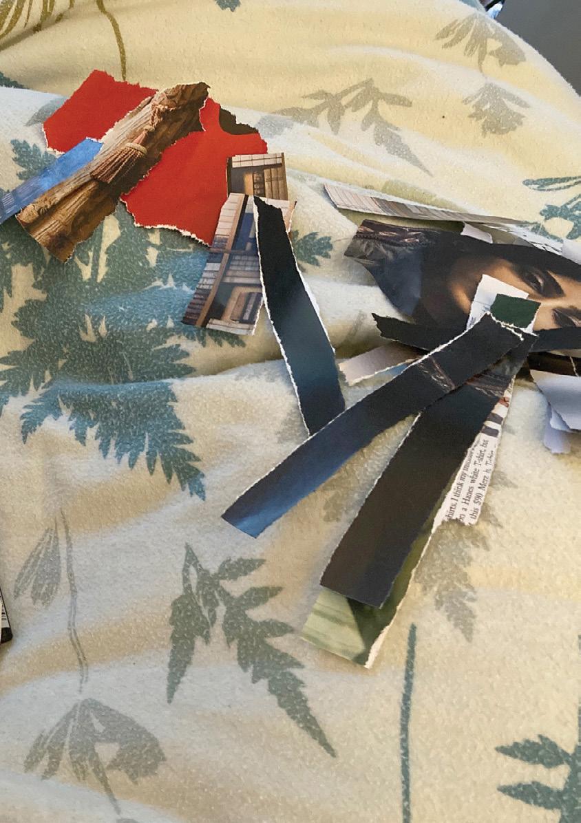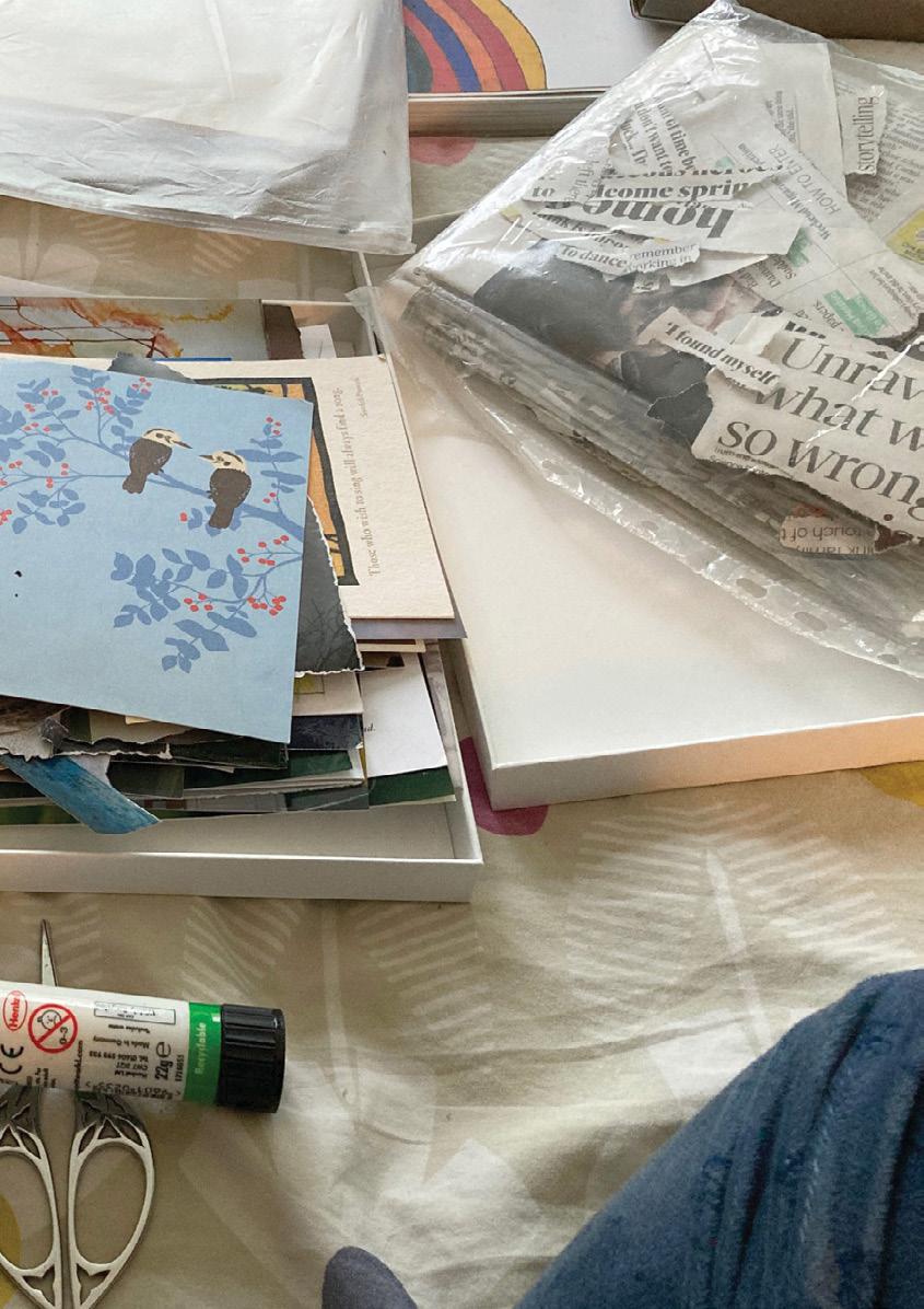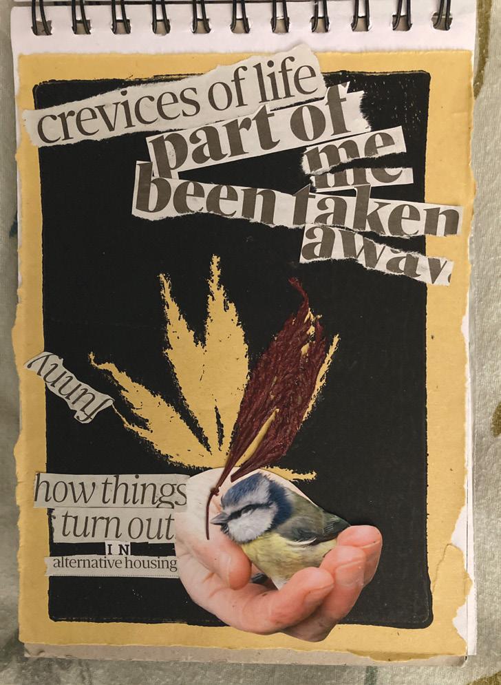 This small selection of the collages created on her bed between April 2022 and April 2023 were spontaneous, intuitive responses to the artist’s situation of life in care.