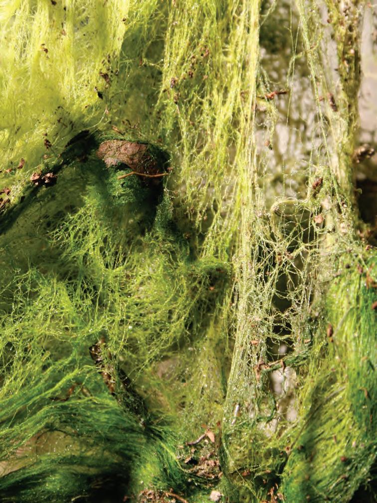 A leaf and its reflection floating among the algae