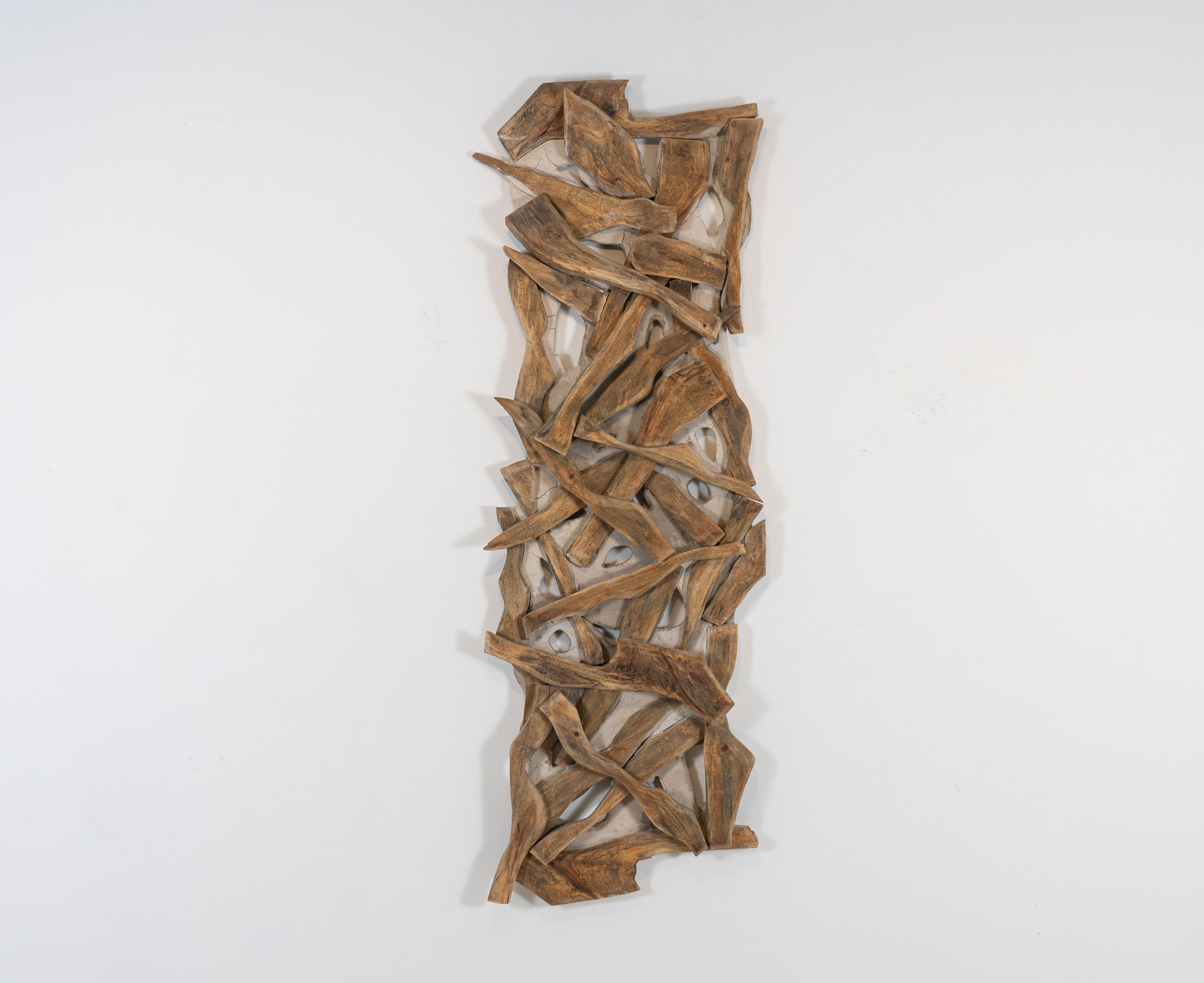 The plaster and concrete mixtures fill the spaces between the trees, formulating a sculptural language that does not overpower the material, but rather responds to it, mends and revitalizes it.