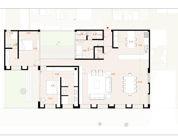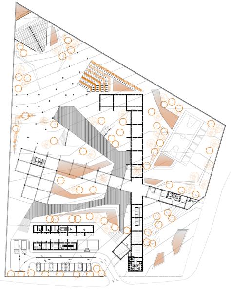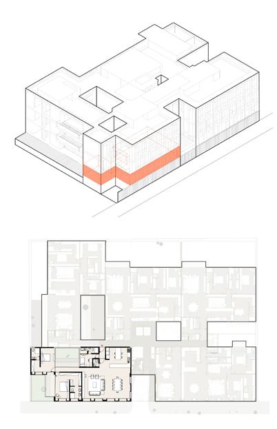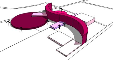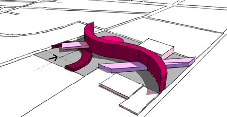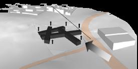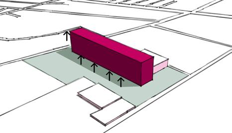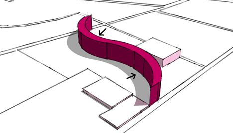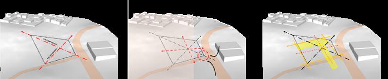 Modificación del volúmen principal adaptandose a ejes secundarios que marcan una continuidad espacial.