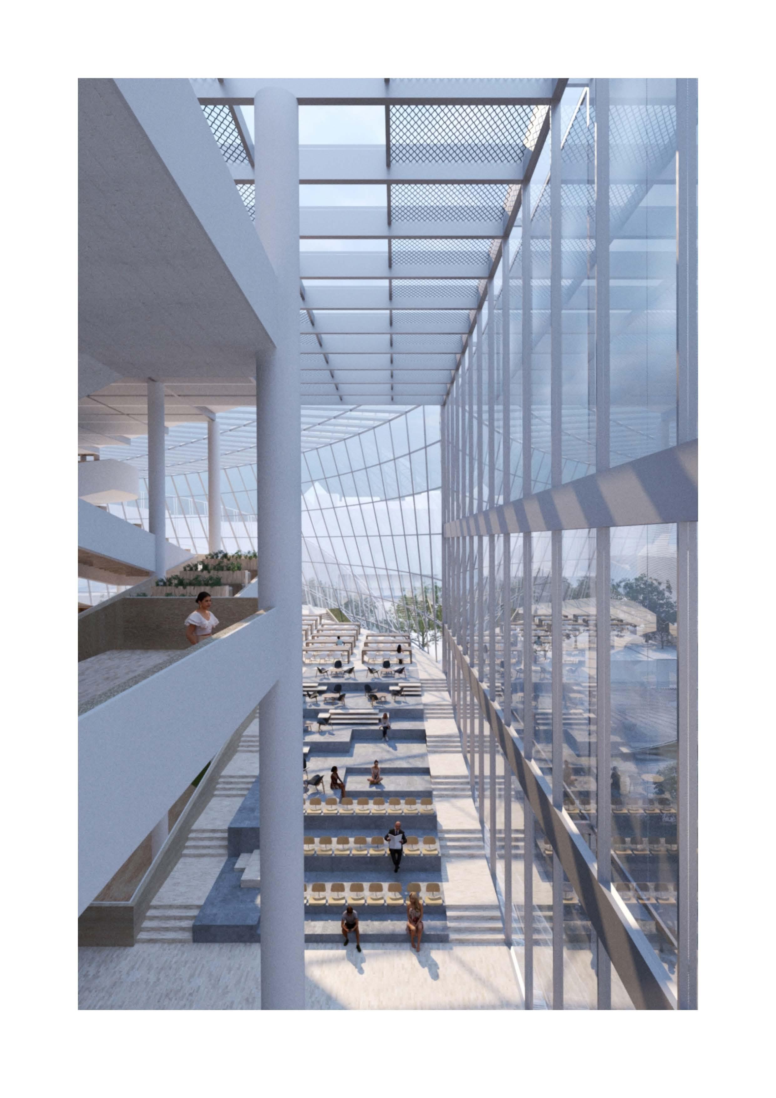 The design is organized into three spatial layers: the ground layer , a landscaped social and recreational zone with dining, reading, and fitness facilities; the body layer , hosting conference, exhibition, and incubation spaces interconnected by public corridors; and the canopy layer , featuring flexible lab spaces including CRO platforms, digital twin labs, and academician workstations, forming a vertical network linking research and industry.