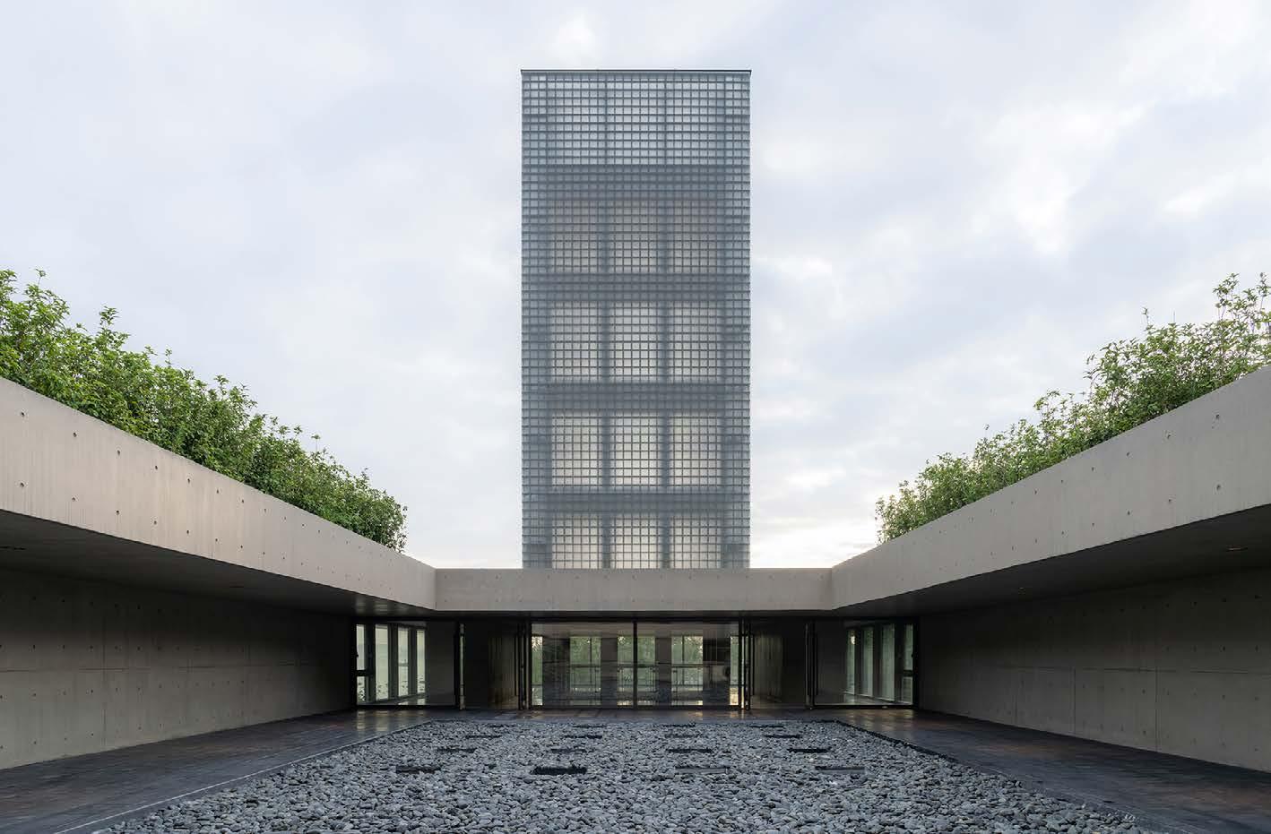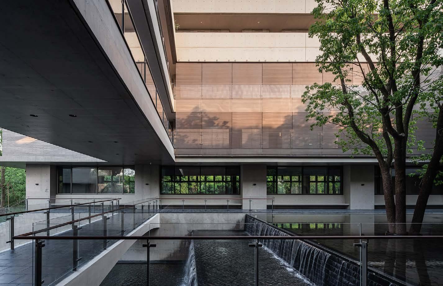 Natural light filters into the western courtyards, forming a series of intimate-scale gardens at ground level. At the heart of the complex, the Rain Pavilion connects multiple courtyards beneath a 16-meter-tall space topped with a circular bronze rain collector. The largest courtyard, Camphor Water Garden, opens eastward to Lake Tai and is framed by double-height guestroom walkways wrapped in bronze mesh. On the riverbank, a 24-meter glass brick Light Tower reflects the shifting sky, echoing the presence of the lake.
