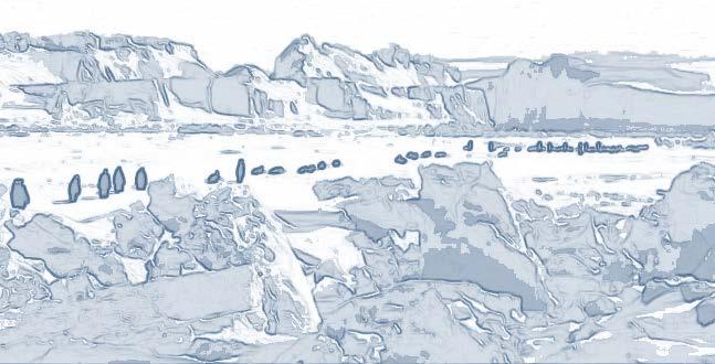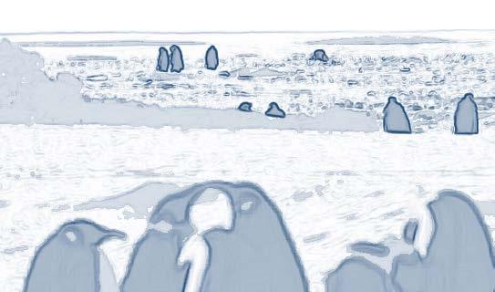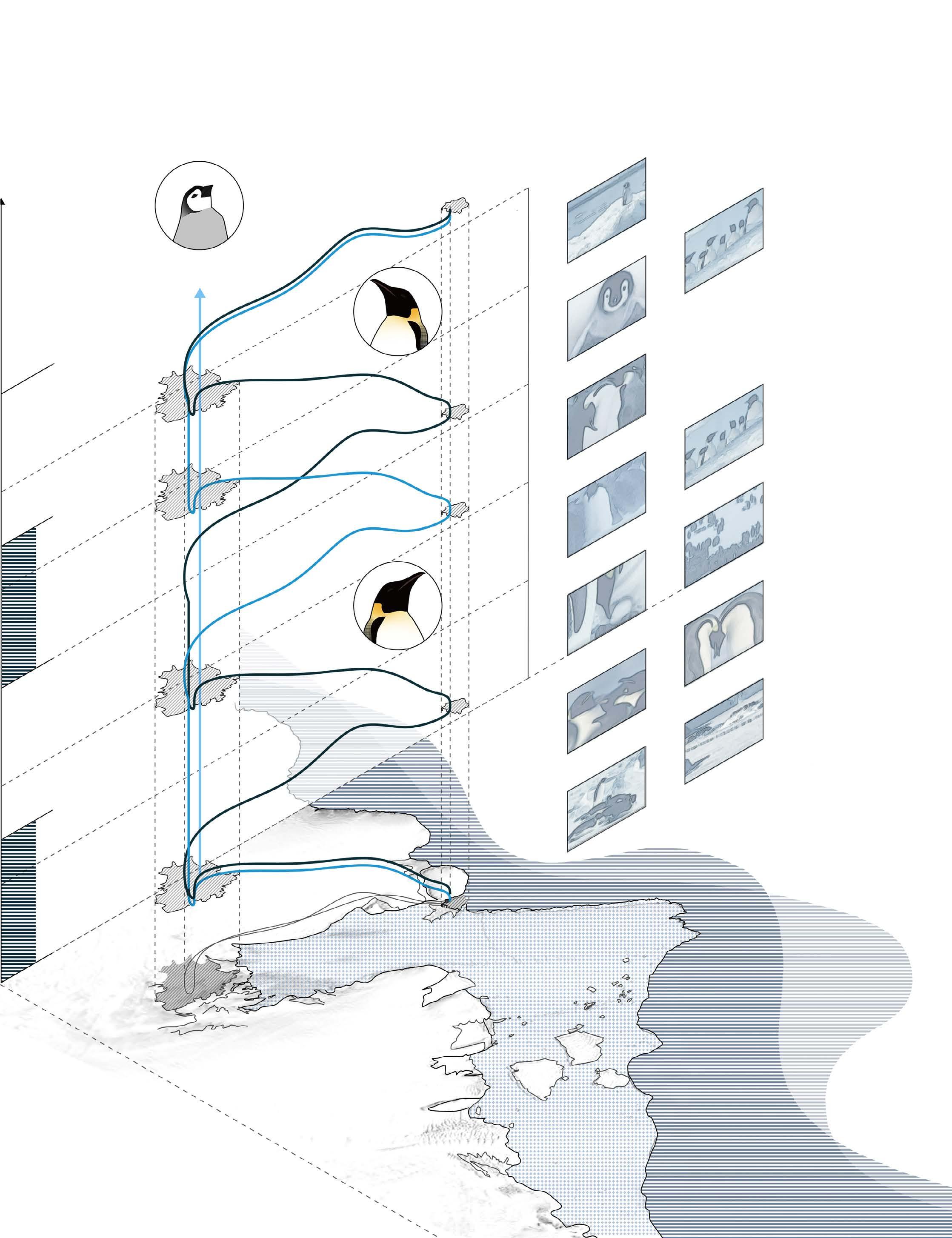 Female penguins separate from thier parteners to forage. This space stands for the breeding ground of penguins, where centrality and enclosure are manifested.