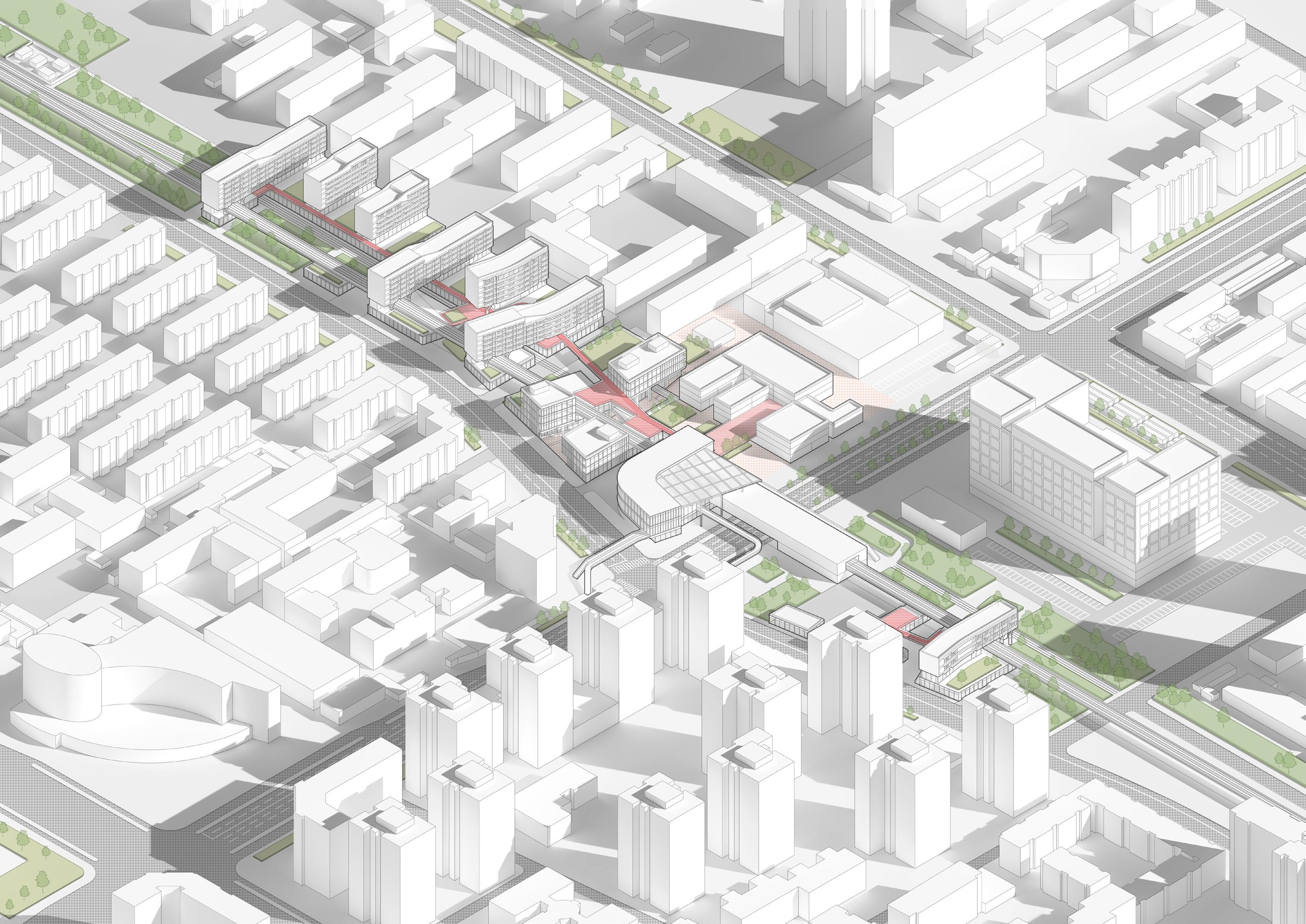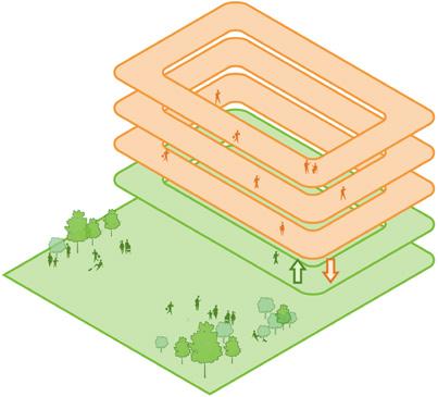 The GREEN route of life gathers people from the public area of parks, subway, and streets, bringing landscape and social activities into the building. It connects public spaces scattered inside the building as well.
