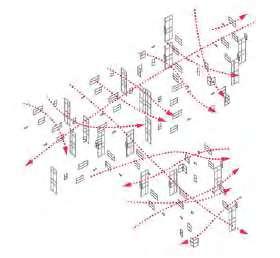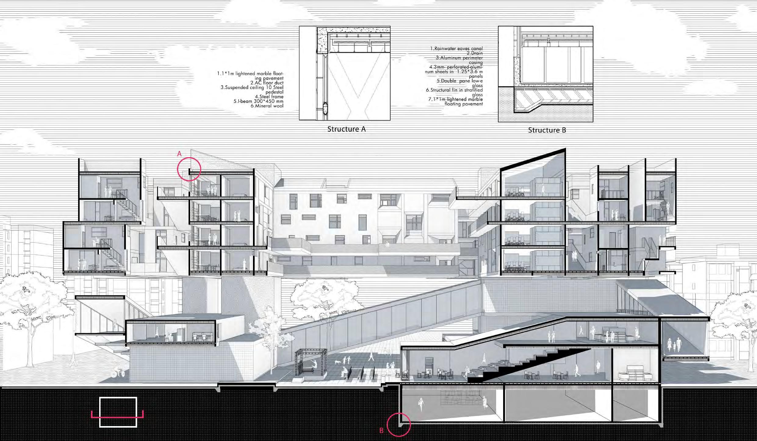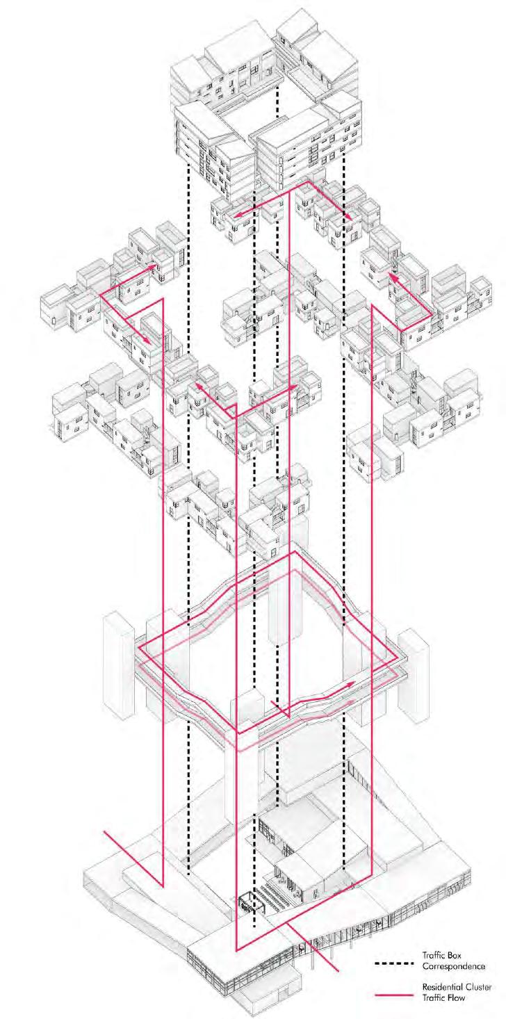 The public facilities in the lower part of the building form a loop with each other, and the upper residential group is formed into a second loop through the indigenous group and the tenant group, which are connected to each other by vertical traffic boxes.