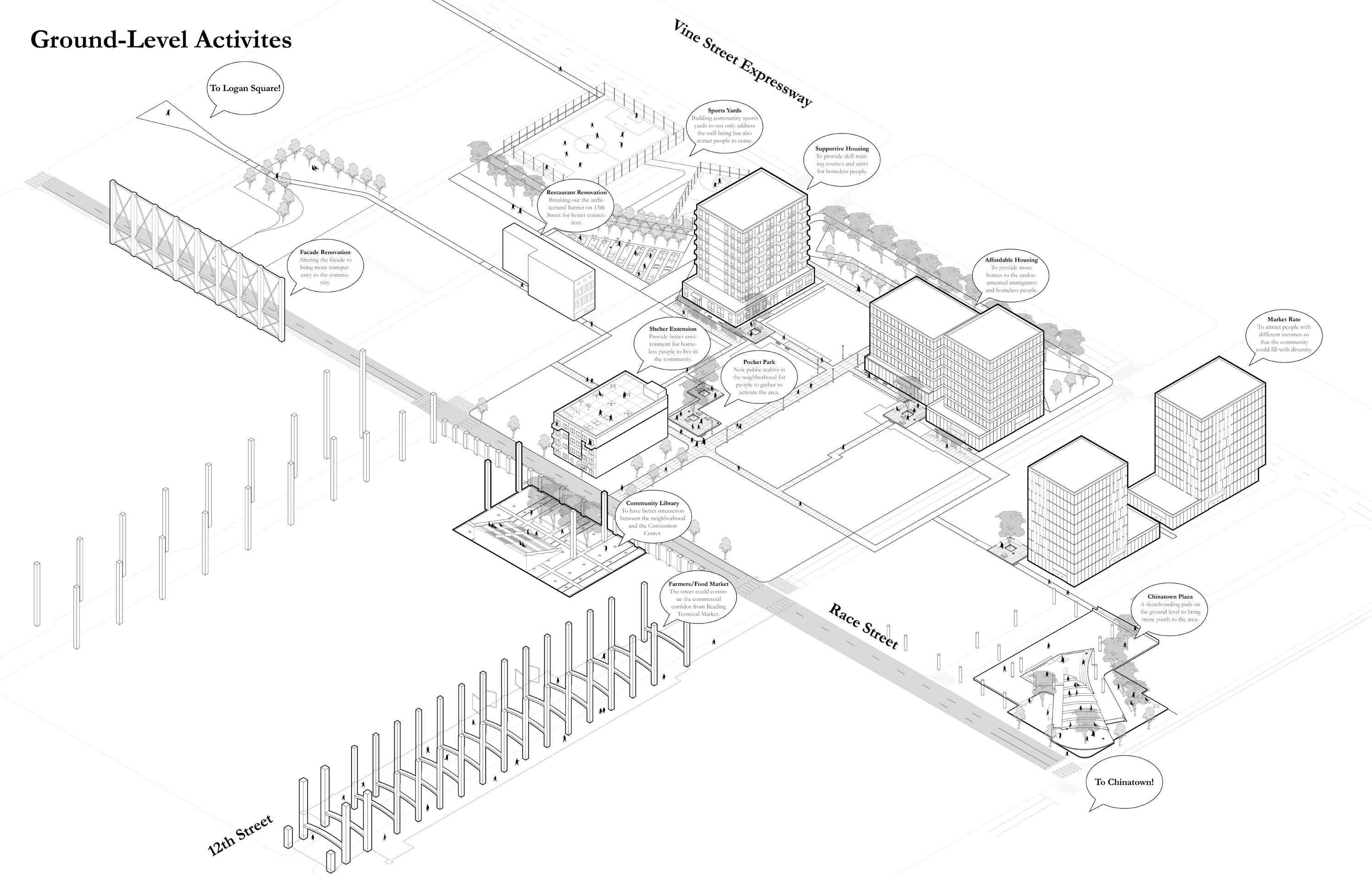 The "Chinatown Community Reconnection and Revitalization" is an ambitious landscape design initiative that seeks to mend the fractures caused by urban infrastructure near Philadelphia's Chinatown. By addressing the challenges of community disconnection, population decline, and deteriorating public spaces, the project places a special focus on meeting the needs of unhoused individuals and undocumented immigrants.