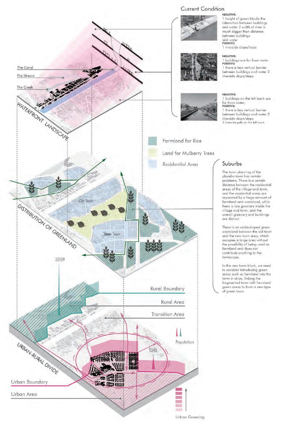 By analyzing the river interface, resource distribution and population distribution of the site, which are the three most important problems, I propose different strategies to solve them. It is hoped that this will improve the landscape and walking experience along the river, enhance the penetration of greenery into the site, introduce the farmland around the site into the neighborhood and redistribute the population.