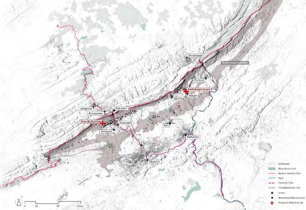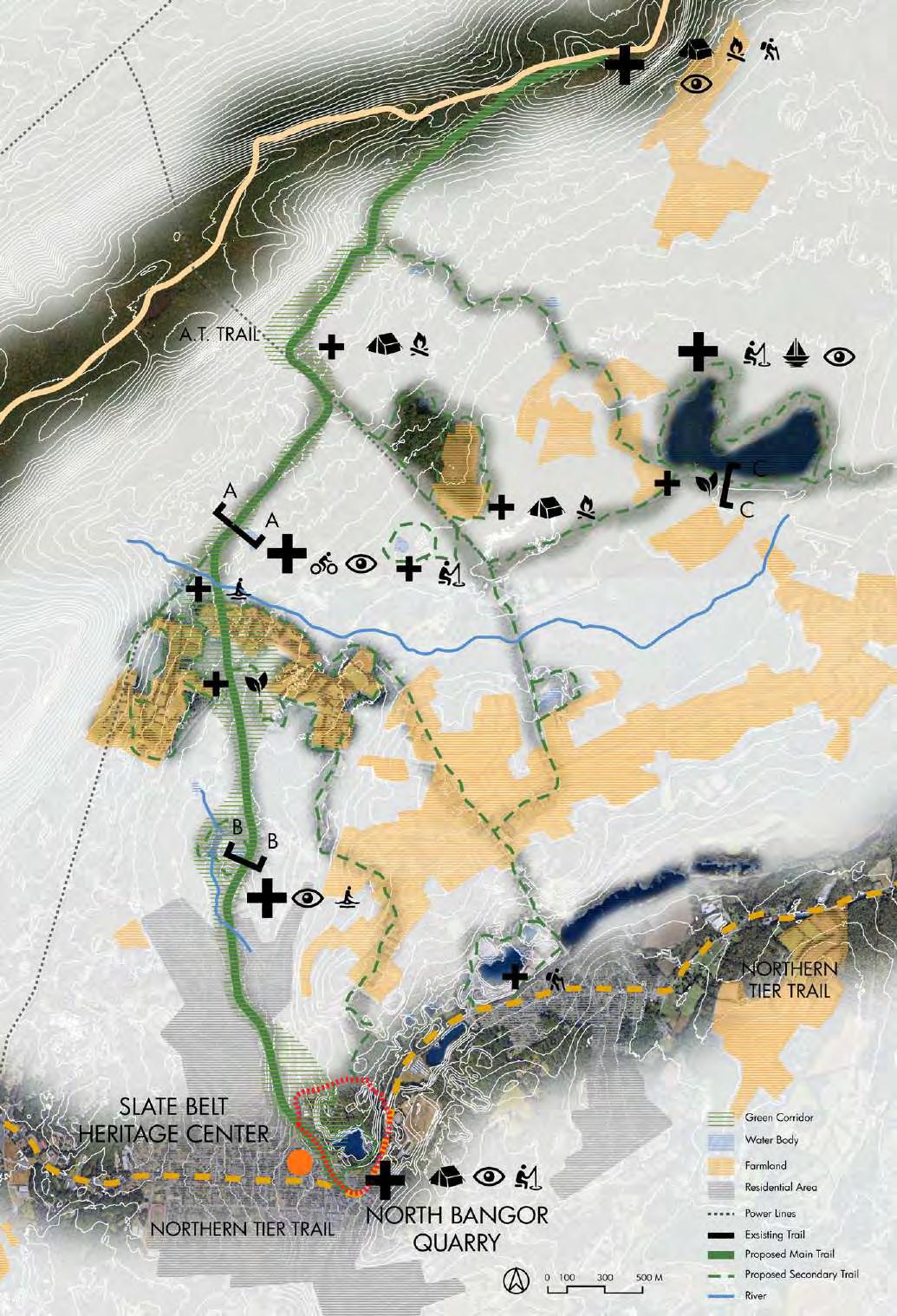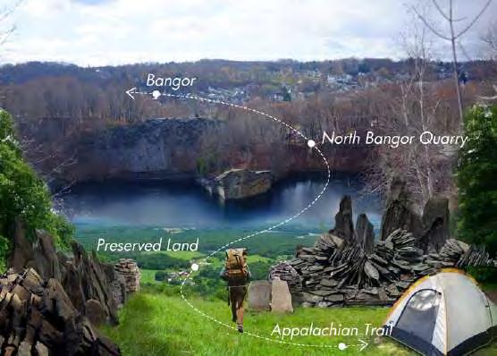 The “Harmony Trails” initiative aims to create a seamless connection between the Appalachian Trail and the Northern Tier Trail near Bangor in Lehigh Valley. This landscape design seeks to link these renowned trails with preserved lands, towns in the Slate Belt region, and abandoned quarries. By doing so, it not only provides day-trip opportunities for urban dwellers but also encourages a return to smalltown living. The project envisions fostering economic growth in the area by promoting tourism, creating a synergy between nature and community, and revitalizing the charm of local towns.