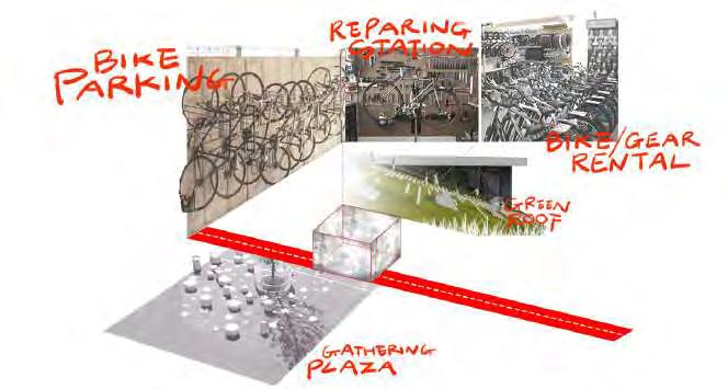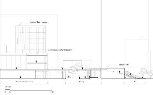 There are mainly 4 key components in our design proposal, the Convention Center renovation and extension, the neighborhood housing development, the Ramp transformed park connecting to Chinatown, and a community park.