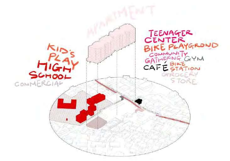 The corridor hub is a dynamic community space surrounded by apartments, schools, and local businesses. It includes areas for kids’ play, a teenager center, and a bike playground, along with amenities like a café, grocery store, and bike station. These features make it a lively gathering spot, encouraging social interaction and supporting everyday activities for residents and visitors alike.