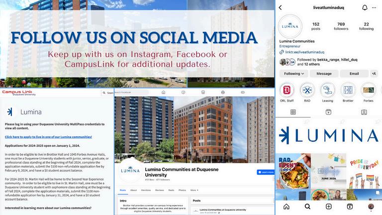 We are excited you chose to live in the Lumina Communities this upcoming academic year and we are so eager to get to know you! Please follow us on Instagram, Facebook, and CampusLink for additional updates