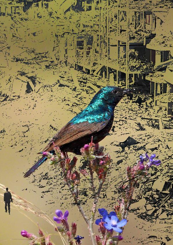 Olives trees decimated, resilience marks the sunbird’s nature; nesting in craters hollowed out by shells. From here, even above gunfire, the sunbird’s song pitches high.