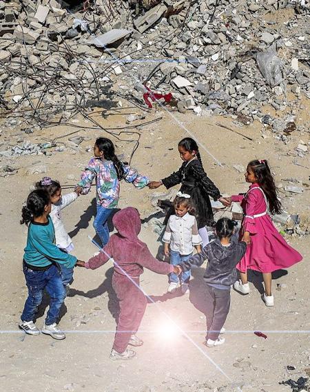A rhyme dredged from childhood springs to my lips. First impression on seeing this photograph. Gaza children playing in the rubble. Behind your playful dance, slabs of smashed concrete resemble broken tombstones. Reveal a terrible truth.