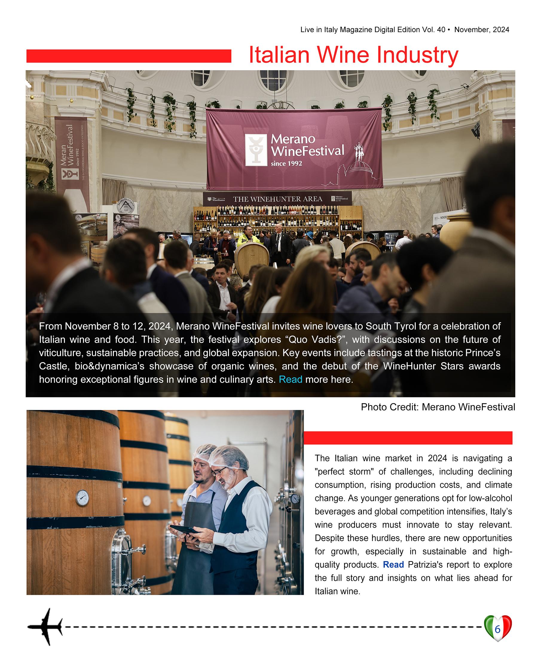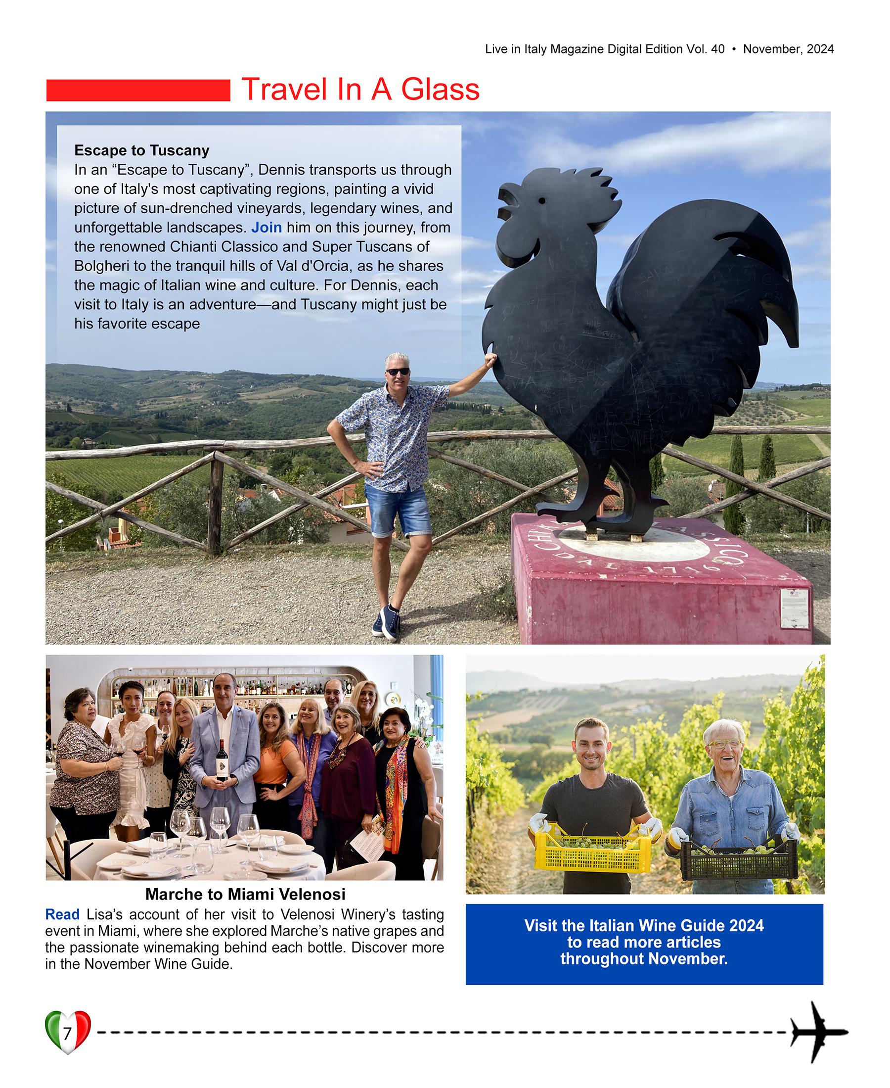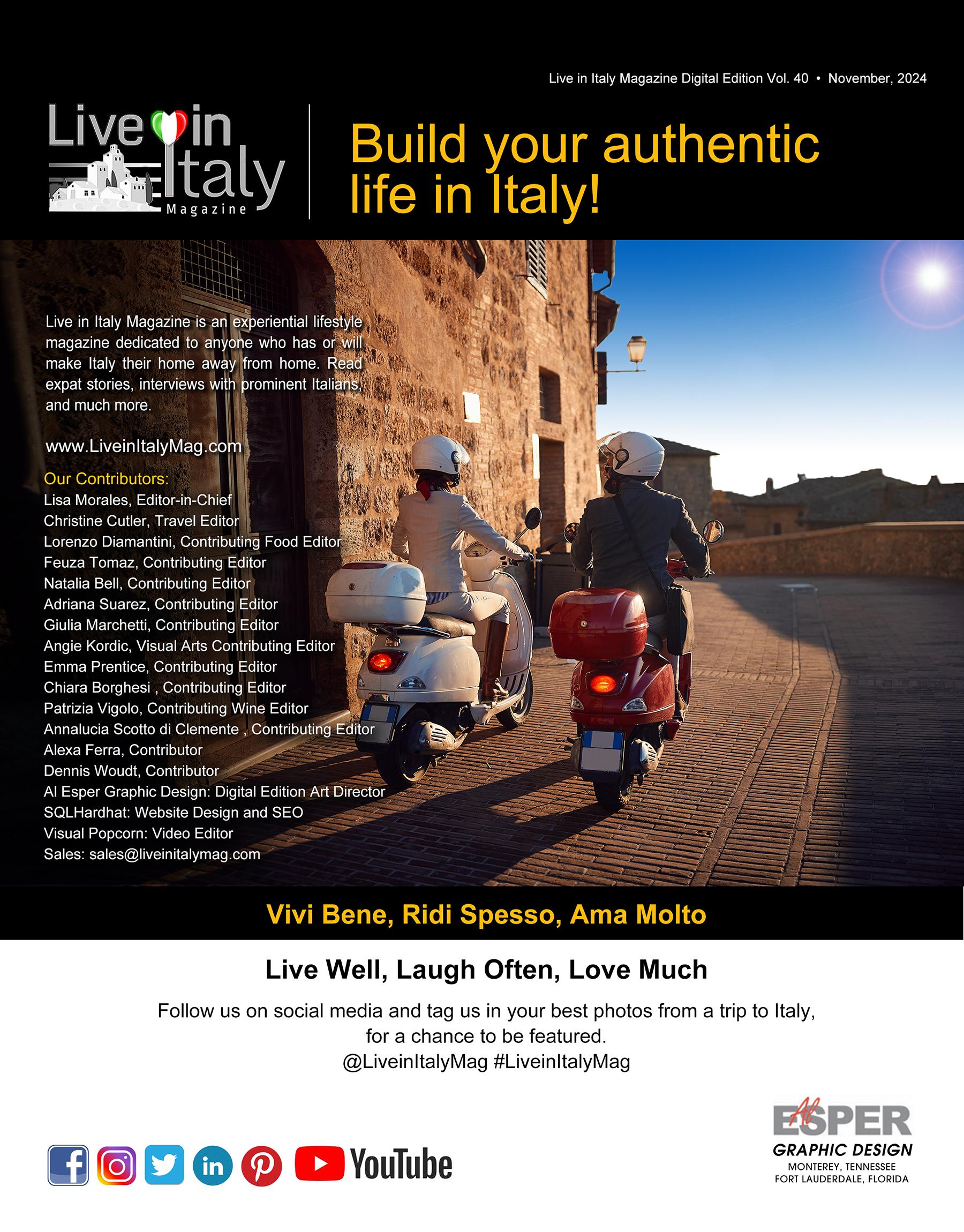 This November, immerse yourself in the essence of Italian culture, travel, and fine wines. Our cover story features an exclusive interview with Audrey and Manlio of Travels with Audrey, revealing their approach to authentic Italian travel in Friuli-Venezia Giulia, from historic sites to artisanal wines. This month also marks the debut of our 2024 Italian Wine Guide, showcasing in-depth articles on Tuscany’s legendary vineyards, native grapes from Marche, and insights on Italy’s evolving wine industry. Explore the Merano WineFestival, Emozioni in Malga in Alto Adige, and the latest on direct flights from LA to Rome. Each article invites you to discover Italy’s timeless charm this holiday season.