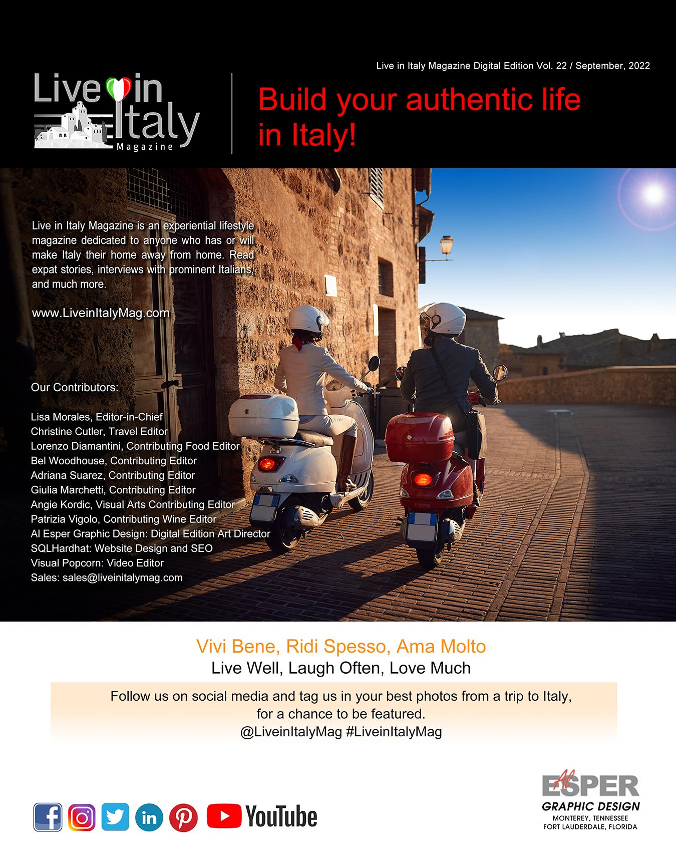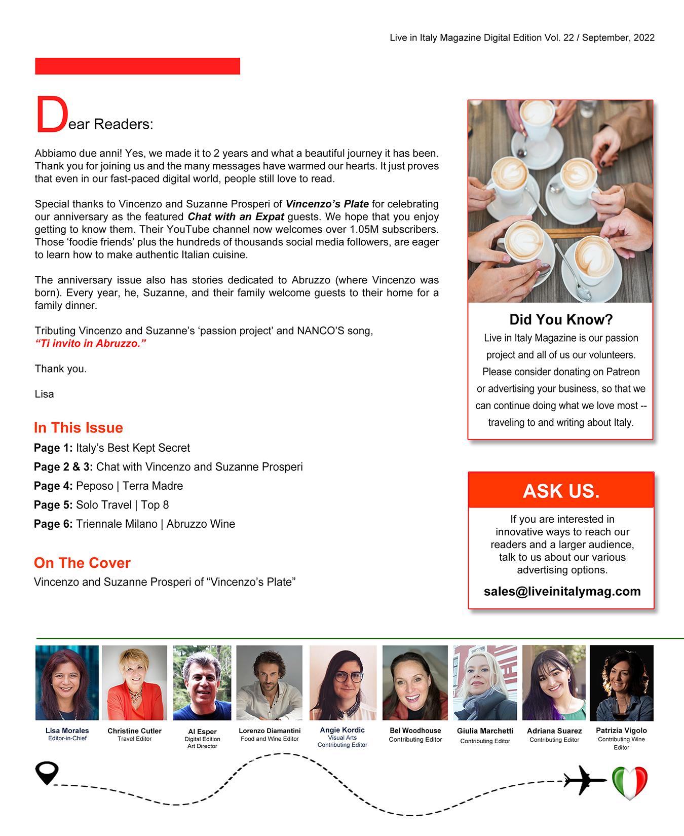 Live in Italy Magazine's 2nd Anniversary issue is here featuring Vincenzo Prosperi and his wife Suzanne of the YouTube channel Vincenzo's Plate. Millions of foodie friends follow Vincenzo to learn how to cook authentic Italian food. Discover more about Abruzzo and why you should visit. Make a Tuscan harvest dish, learn about Slow Food's Terra Madre and Triennale Milano, plus tips on traveling solo in Italy.