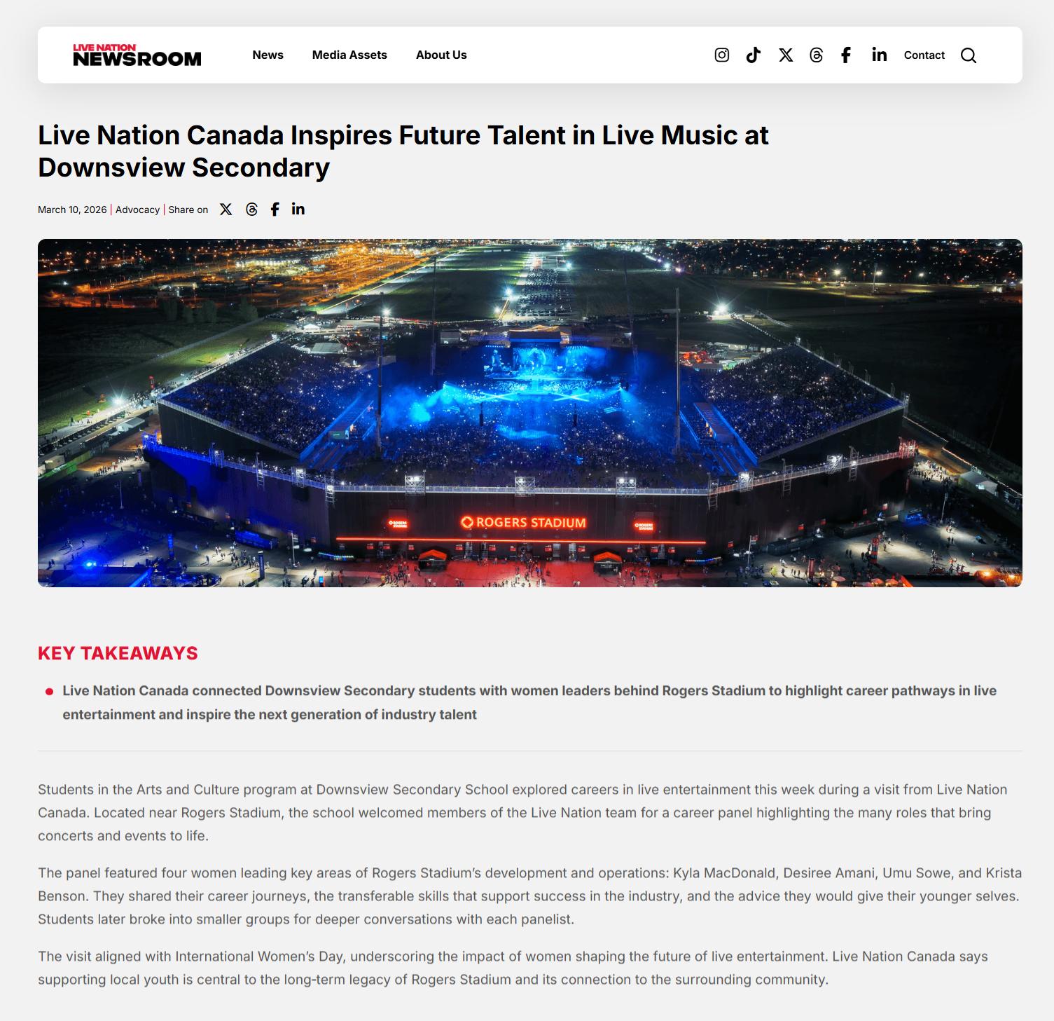 Students in the Arts and Culture program at Downsview Secondary School explored careers in live entertainment this week during a visit from Live Nation Canada. Located near Rogers Stadium, the school welcomed members of the Live Nation team for a career panel highlighting the many roles that bring concerts and events to life.