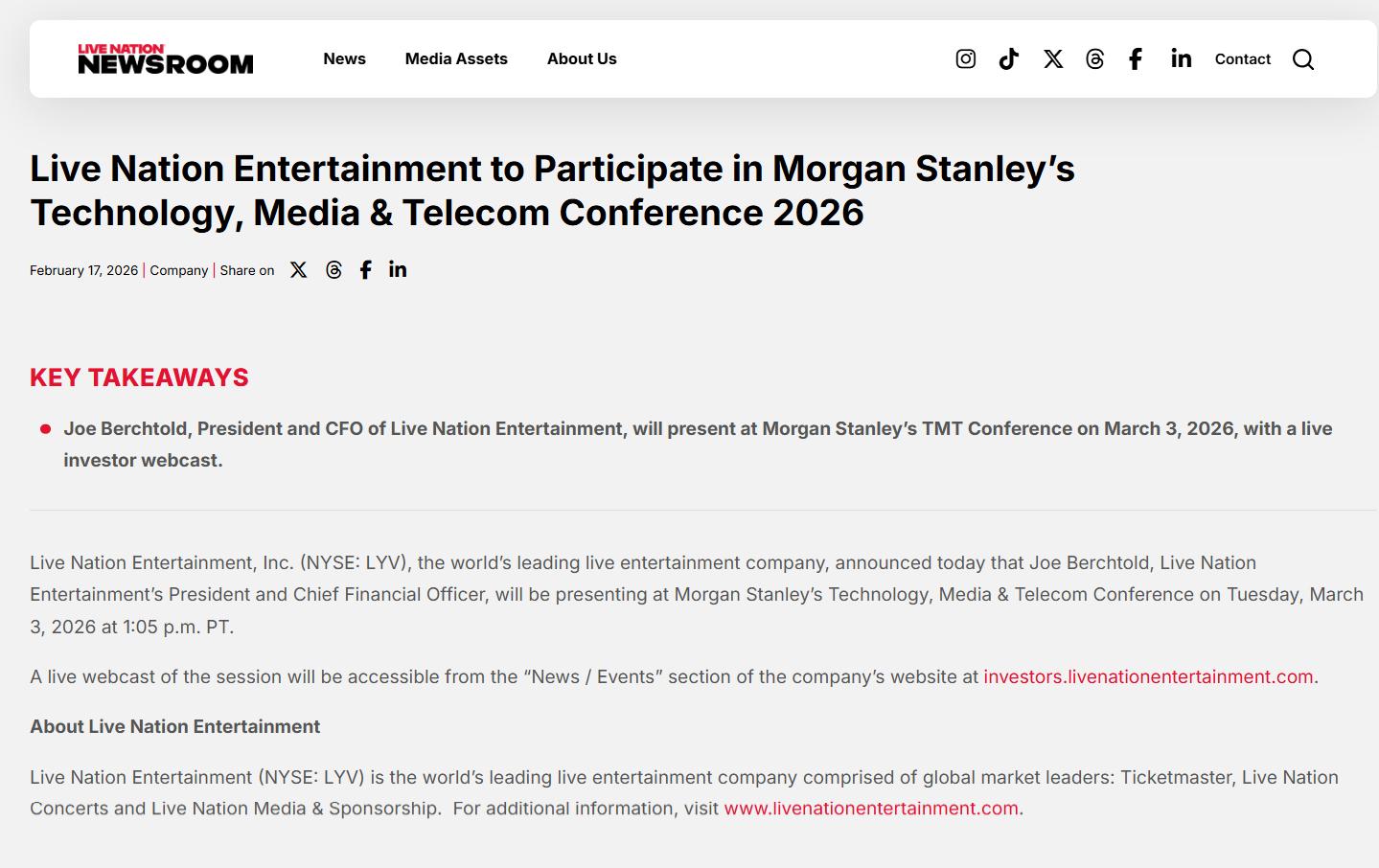Live Nation Entertainment, Inc. (NYSE: LYV), the world’s leading live entertainment company, announced today that Joe Berchtold, Live Nation Entertainment’s President and Chief Financial Officer, will be presenting at Morgan Stanley’s Technology, Media & Telecom Conference on Tuesday, March 3, 2026 at 1:05 p.m. PT.