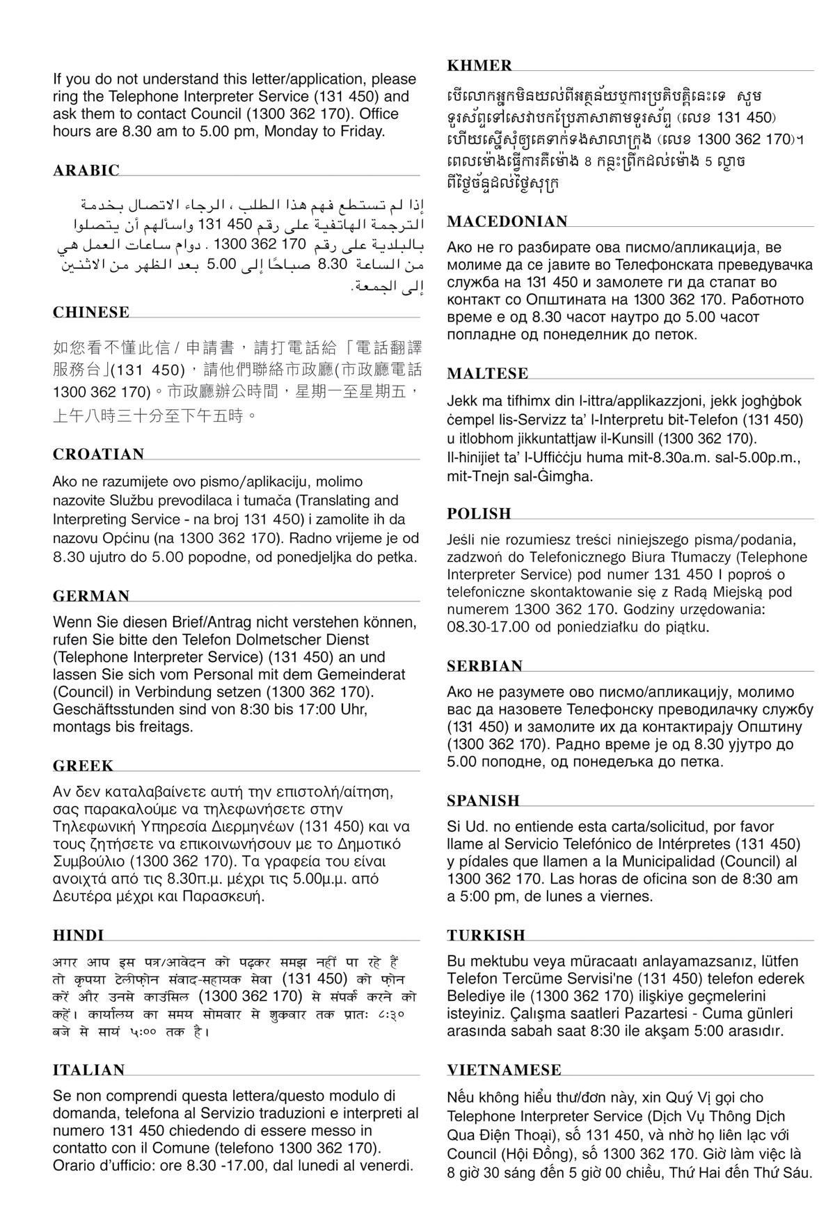If you do not understand this document, please ring the Telephone Interpreter Service (131 450) and ask them to contact Council (1300 362 170).