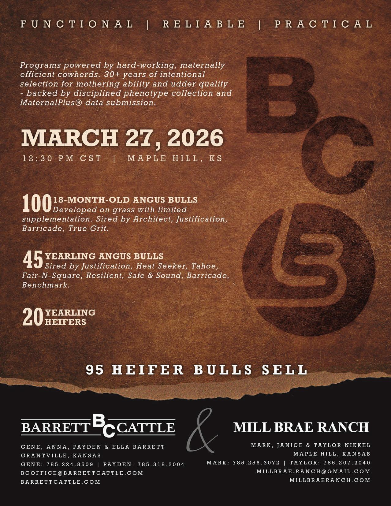 • 3/27/2026-Barrett Cattle & Mill Brae Ranch Bull Sale -Maple Hill, KS-Sale