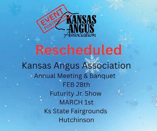 The Kansas Angus Association (KAA) Banquet and 74th Annual Meeting HAS BEEN RESCHEDULED ( due to the heavy snow and extreme temps on Jan 24-25) to February 28 in Hutchinson at the Kansas State Fairgrounds . The educational presentations and annual meeting will be in the afternoon. The annual banquet which will include a social hour, the Kansas Angus Auxiliary scholarship auction, honorary member induction, KAA Directory page auction, Miss Kansas Angus crowning and the KJAA t-shirt fundraiser auctionwill be in the 1861 Club on the fairgrounds lateron Saturday evening. The Futurity Junior Show will be on March 1st.