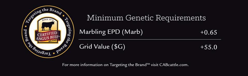 The Certified Angus Beef ® Targeting the Brand™ logo is used to identify any registered Angus bull with a minmum marbling EPD (Marb) of +0.65 and an Angus Grid Value Index ($G) of +55 or higher. Sire-identified carcass data from more than 8,600 records in the American Angus Association database show these minimum thresholds for Marb and $G achieve an average of 50% CAB acceptance. While a sire’s genetic potential only accounts for a portion of marbling performance in a calf crop, these benchmarks provide commercial cattlemen a starting place to identify genetics that will go on to bring performance premiums on quality beef grids.
