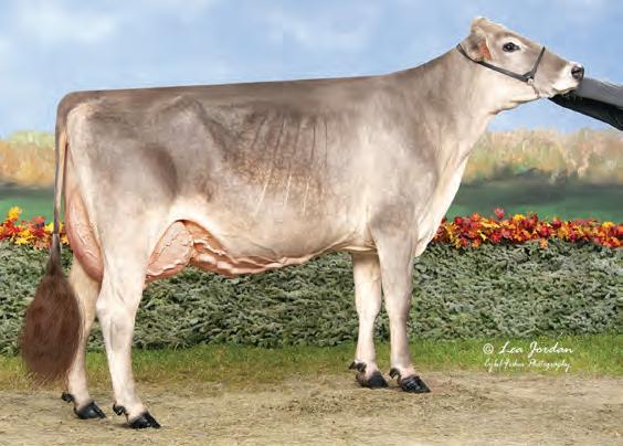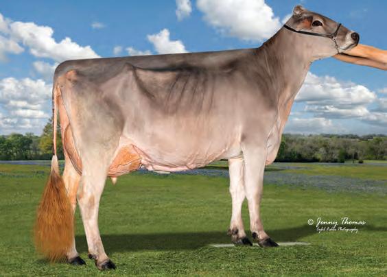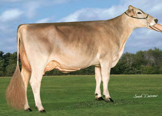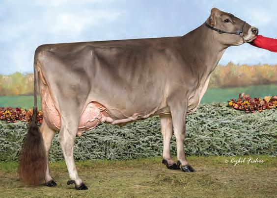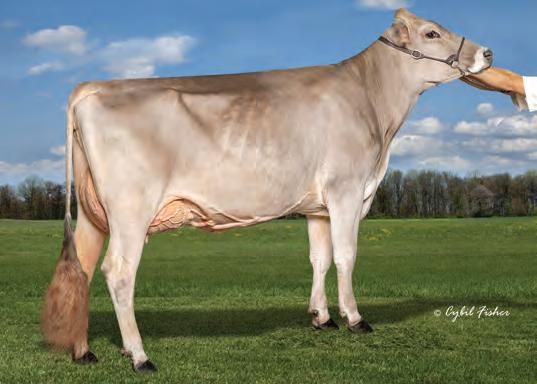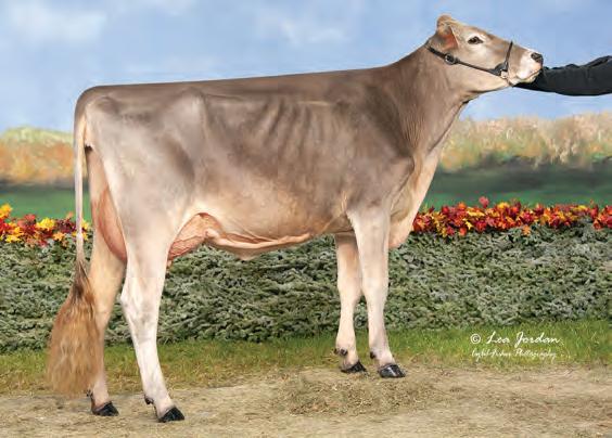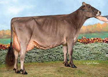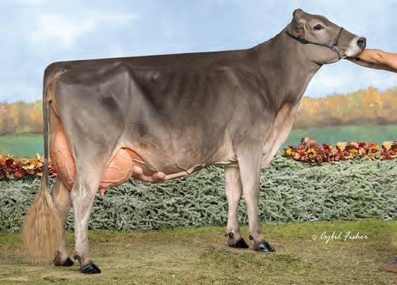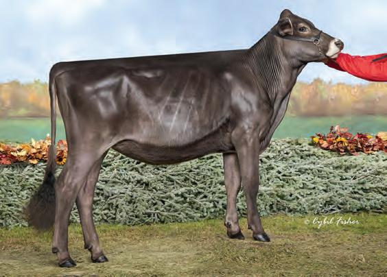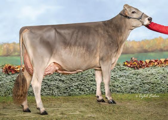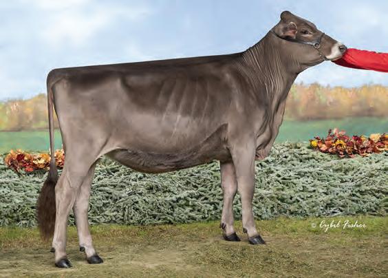 This sister is partial to the Brown Swiss herd and has had some success in the show ring. At the Ohio State Fair in 2024, she showed Rad-ical Famous Tampa, now scored V86-V87US. She won the Junior Three-YearOld Class and went on to be named Intermediate Champion and Reserve Grand Champion of the open and junior shows. Tampa was purchased at the 2023 Midwest Revue Royale as a bred heifer from Lindsey Rucks-Pettit, FL. Her dam is a maternal sister to Peach-Kist Total Tango 2E95.