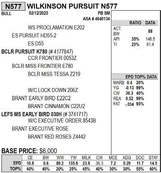 SaleFormat: Thesalewillberunonaprivatetreaty bid-offformat.Everybullisgivenabasepriceand interestedpartiesarerecordedforeachbullleadingupto andonsaleday.Onthesaledate,wethenproceedwith phonebiddingbetweenallinterestedpartiesforeachbull. Buyershaveuntil7pmonMarch8thtobidonallbullsof interest,atwhichtimenonewentrieswillbeaccepted.A spreadsheetwillbepostedonourwebsitesobuyerscan live-trackcurrentbids.