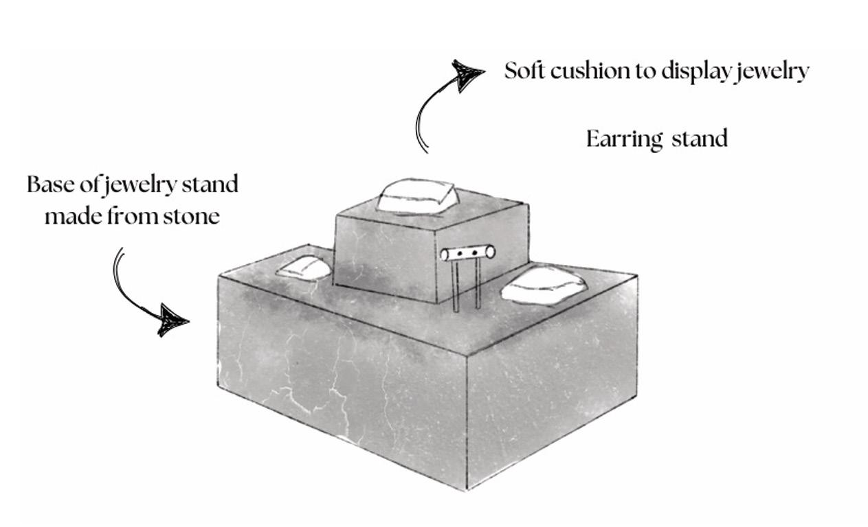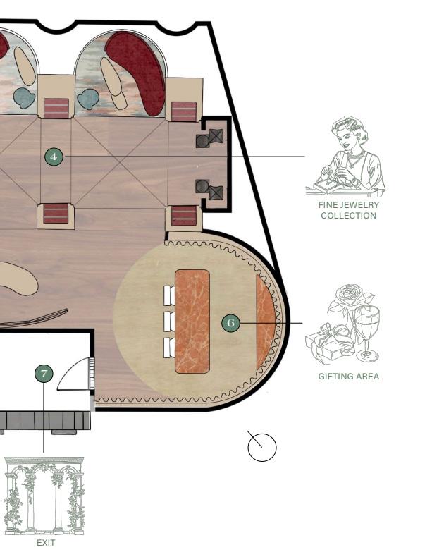 The fine jewelry display is inspired by the mountains of Provence, featuring a velvet-lined interior that curves to create three distinct tiers for showcasing our silver, gold, and gemstone pieces. The back wall is mirrored, and the entire display is encased in glass to protect the jewelry.