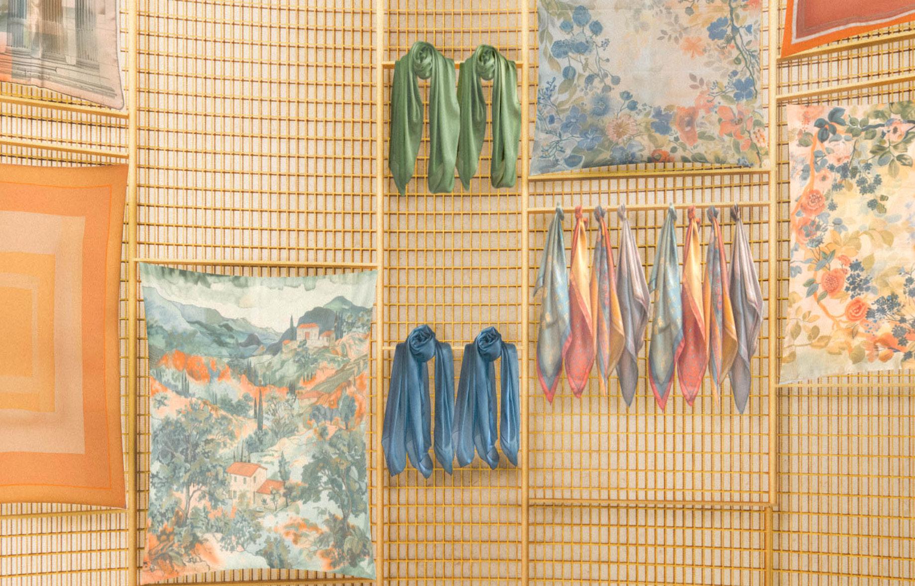 The silk scarf collection is elegantly displayed on a custom-made, organically shaped brass fixture, designed to showcase our collection in various captivating arrangements.