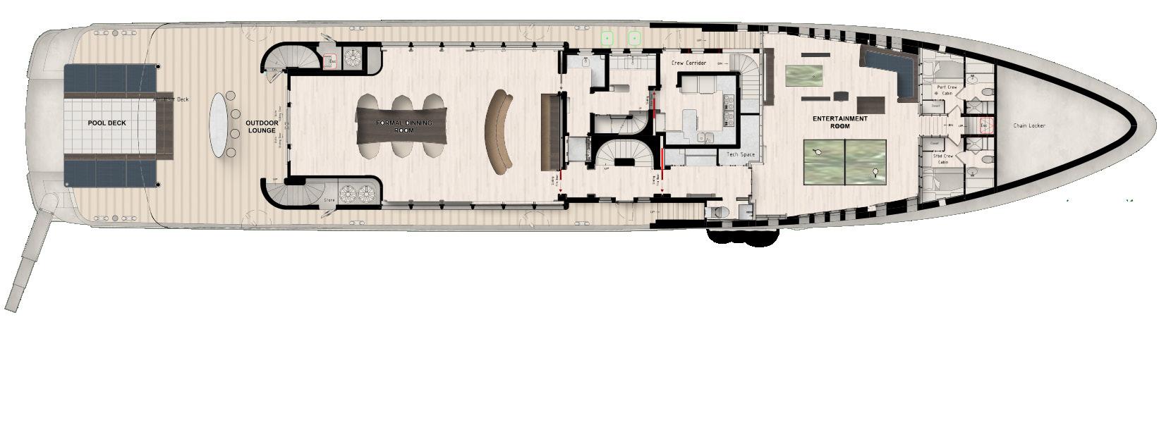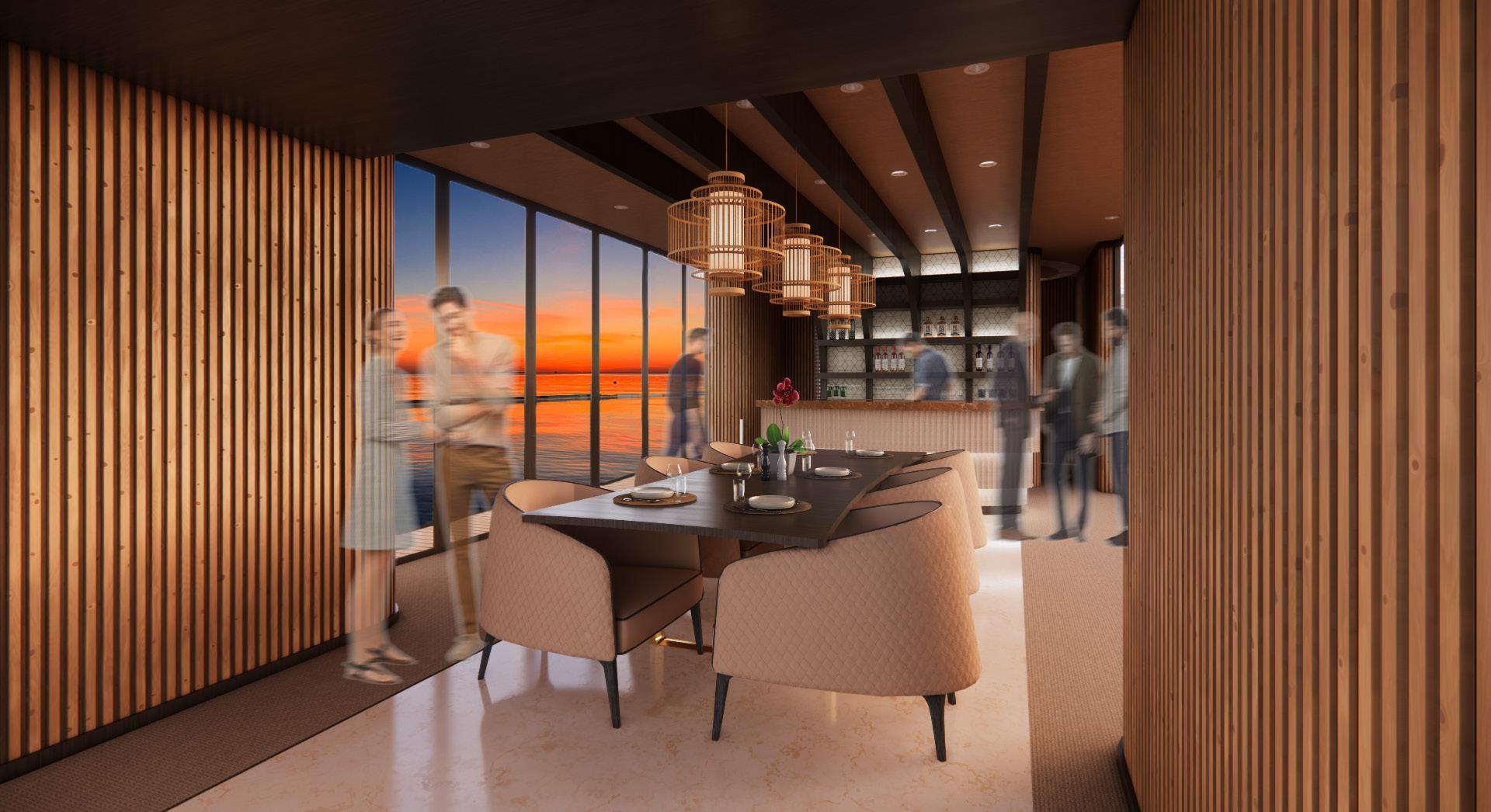 In the game docks, guests can engage in play with activities typically found on land, including an immersive golf simulator and a versatile game table that transforms for ping pong, pool, and more, creating a dynamic and social entertainment space.