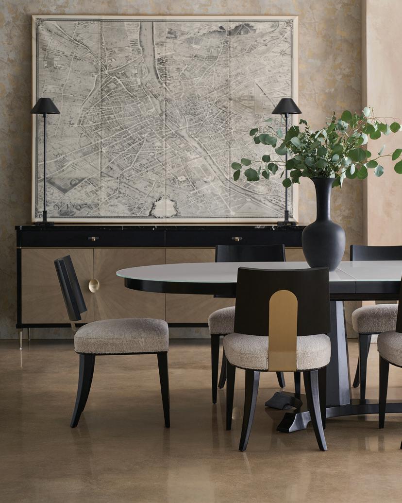 LEFT: Enhance your dining space with the Neve Round Dining Table. With a captivating circular design and sleek alabaster base, this table adds an element of intrigue and drama. The bronzed metal band and burnished bronze interior provide a striking contrast, while the glass top adds refinement.
