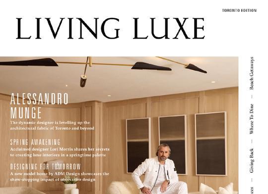 Advertising rates, deadlines and information, email anthony@livingluxe.ca For SUBSCRIPTION inquiries and address changes, email subscriptions@livingluxe.ca | livingluxe.ca | info@livingluxe.ca 14 Leswyn Road, North York, Ontario M6A 1K2