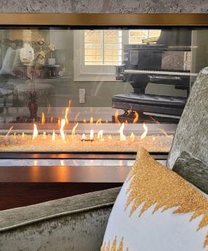 The main level is made up of a spacious floor plan that includes the kitchen, den, dining room, piano room, powder room, living room and mudroom. “My aim is always to go for a timeless look, regardless of the passing trends,” she says. When you walk into the foyer, there are design elements that immediately command attention. The first is the magnificent fireplace, cladded with Cambria stone. “It’s one of the first things you see. It used to be a three-sided fireplace but there was no pizzazz to it — it wasn’t impactful. I really wanted it to be a focal point and for it to be seen from all rooms,” she says. The fresh sage-green colour on the walls was a shade the homeowner felt strongly about, and wanted to keep it incorporated with the new changes. “By keeping the furniture monochromatic, it paired well with the traditional sage colour, but still added a fresh new dimension to the space.” Additionally, Janeiro used modern fabrics and subtle prints to create a juxtaposition in the styling.