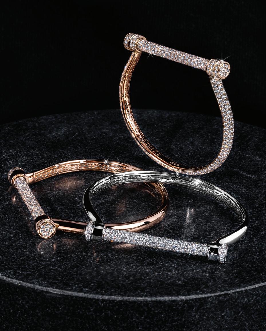 The Jacob & Co. Estribo Diamond Bangle now available at KNAR - Inspired by Andalusian Stallions, and the ornate detailing of traditional Spanish tack, Jacob & Co.’s stirrup or “Estribo” collection, offers a bold, yet elegant take on the exquisite adornment practices of Spanish equestrians.