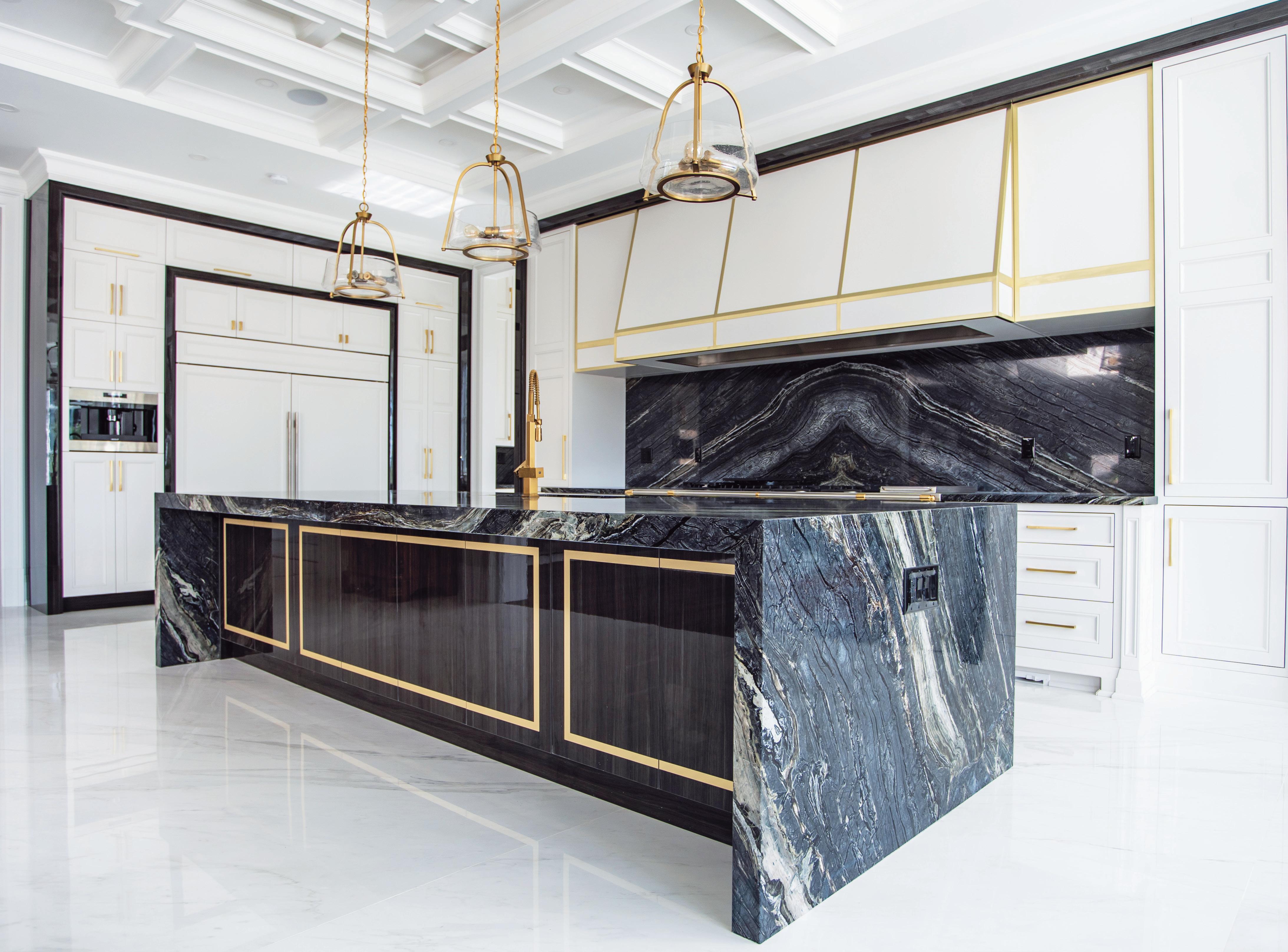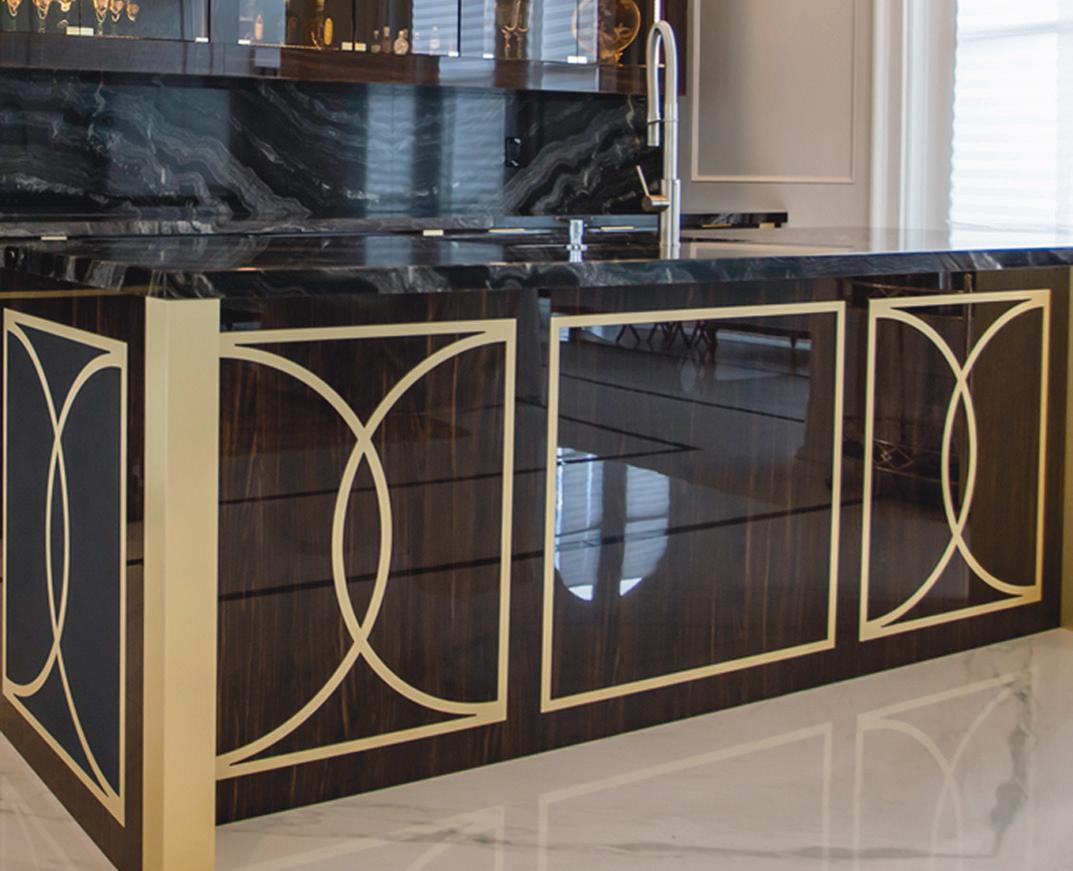 The couple’s character shines through in their kitchen as well. Janeiro opted for beautifully intricate millwork, brass-toned hardware and a metal strip running across the top of the cabinets for a more lavish effect. The kitchen really caters to what is important in the homeowners’ lives — it’s filled with elaborate detailing,