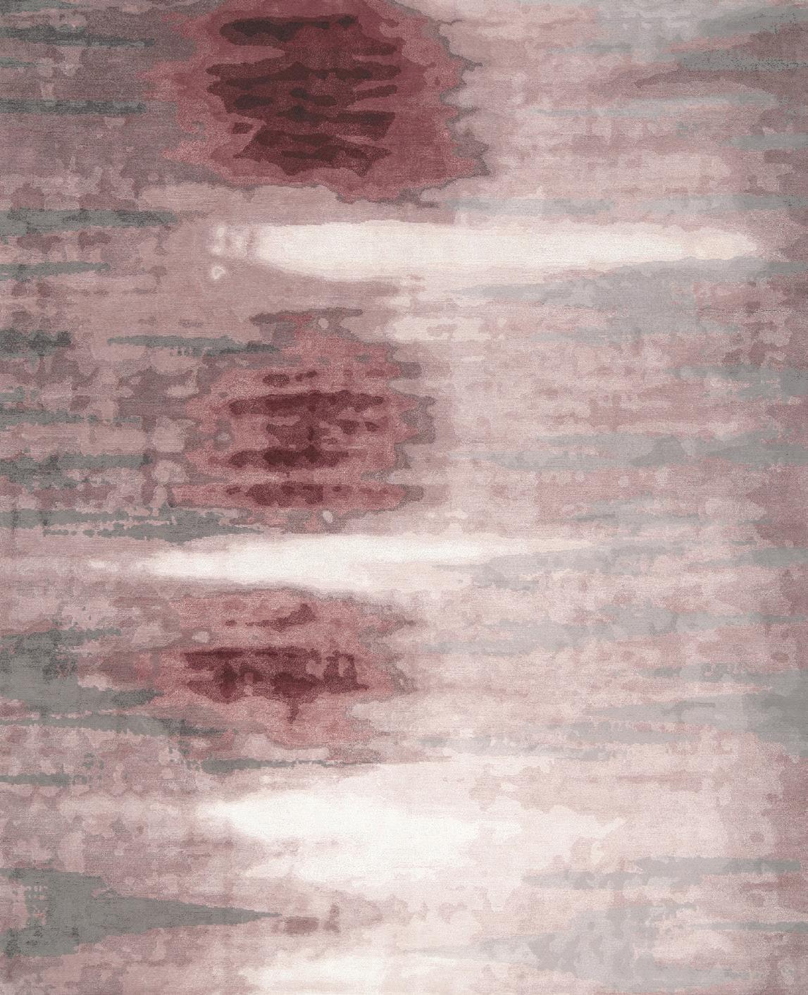 Shadow Raspberry : Softly blurred lines of shimmering raspberry silk spread across the murky mist design. This rug is handknotted in fine Tibetan wool with pure Chinese silk in 100 knot.