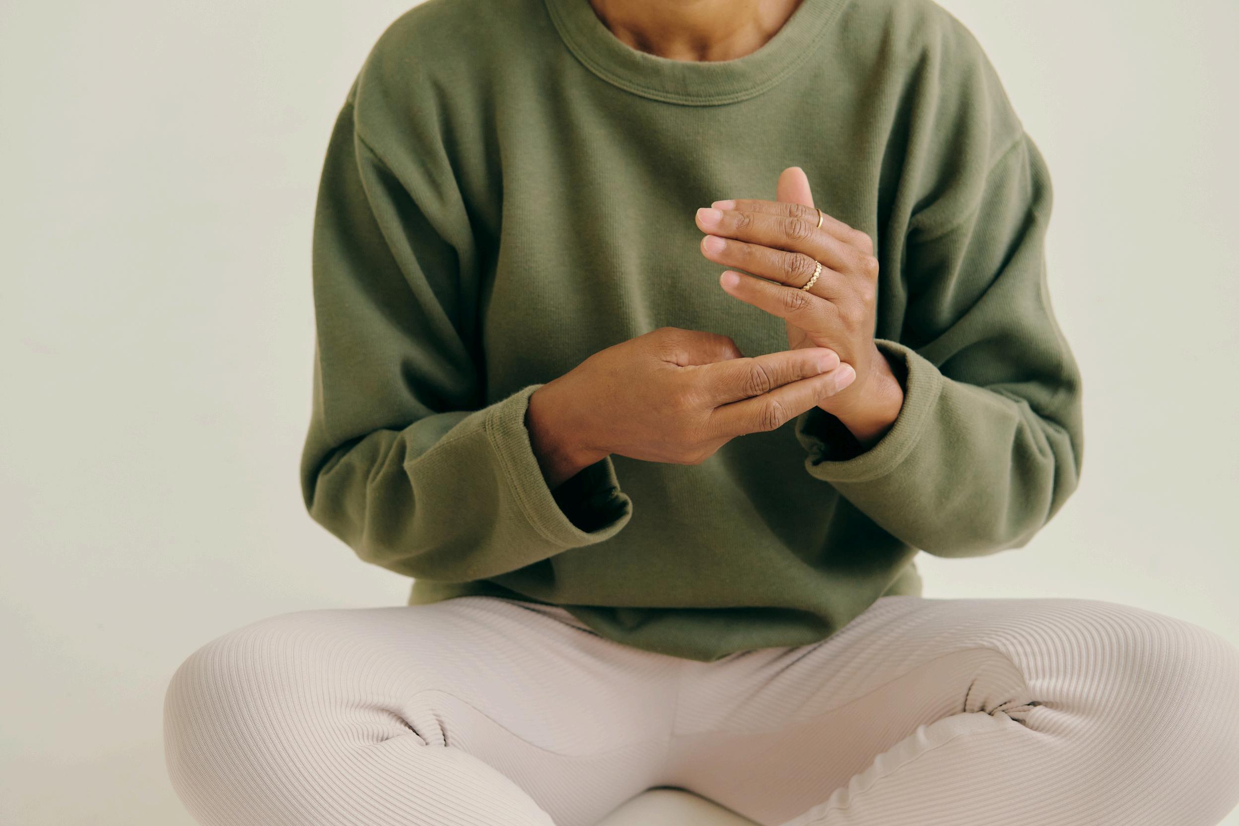 Place your hand on your chest or belly to connect with your breath. Visualize tension melting away with each exhale.