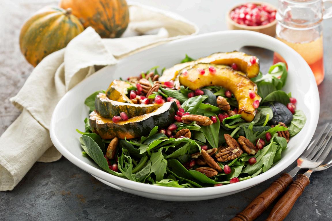 Combine greens and salad ingredients with roasted squash Drizzle with dressing and gently toss to combine