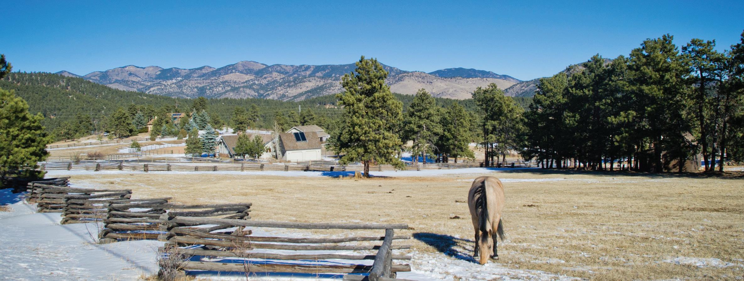 Evergreen Meadows West is located down the road from Flying J Ranch and Arapahoe National Forest. Just 15 minutes from downtown Evergreen, here you can find quiet home sites on two-plus acres, as well as gorgeous views and a convenient location.
