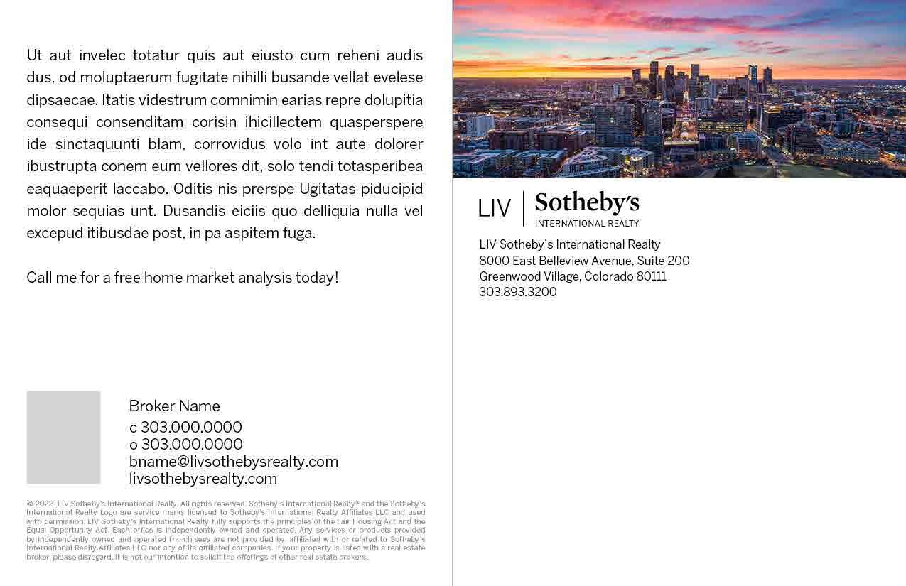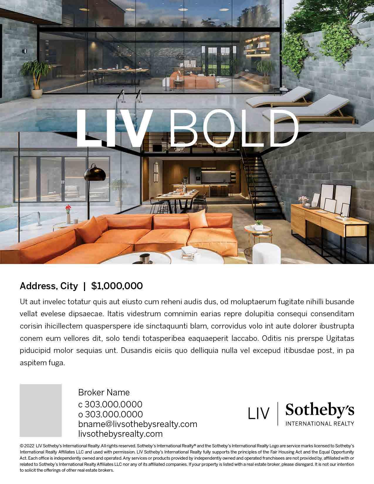 PROPERTY DETAILS • Property Details Broker Name c 303.999.9999 o 303.893.3200 bname@livsothebysrealty.com livsothebysrealty.com © 2020 LIV Sotheby’s International Realty. All rights reserved. Sotheby’s International Realty® and the Sotheby’s International Realty Logo are service marks licensed to Sotheby’s International Realty Affiliates LLC and used with permission. LIV Sotheby’s International Realty fully supports the principles of the Fair Housing Act and the Equal Opportunity Act. Each office is independently owned and operated. Any services or products provided by independently owned and operated franchisees are not provided by, affiliated with or related to Sotheby’s International Realty Affiliates LLC nor any of its affiliated companies. If your property is listed with real estate broker, please disregard. It is not our intention to solicit the offerings of other real estate brokers. Property Description HEADLINE Property Description